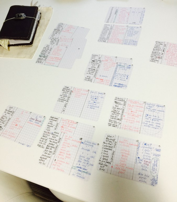 My scrapbook / craft table has become a language lesson centre with all of my language cheat sheets spread out and ready for me to add to as and when I hear a word or phase in French, Spanish or Portuguese from my playbacks I didn’t write down yet. I am starting to get the languages down pat (well good enough anyway) but my “accent” for each is sounding oddly blended. I am rolling Rs and sh’ing Sh all over the place, even when I don’t need to. I am hoping that the nice people of the countries we visit will just find me eccentric and dramatic but still understand me. (like y’all do here in Canada!)