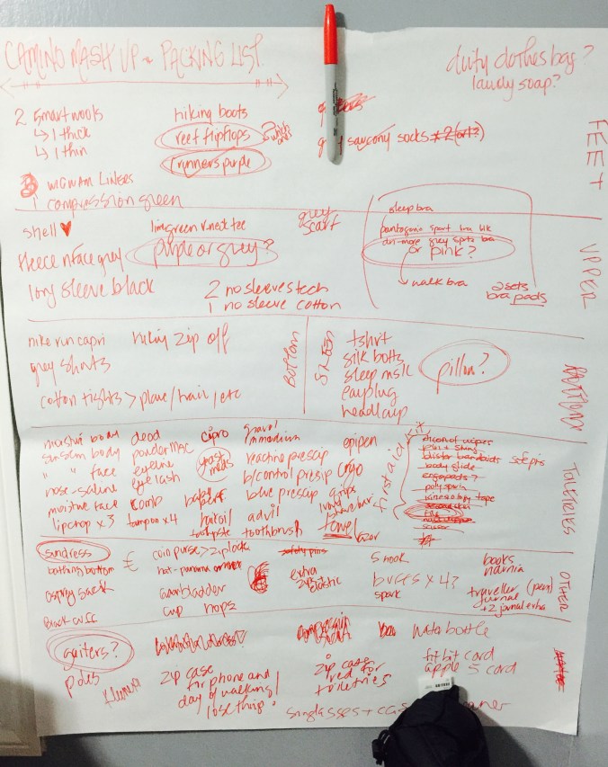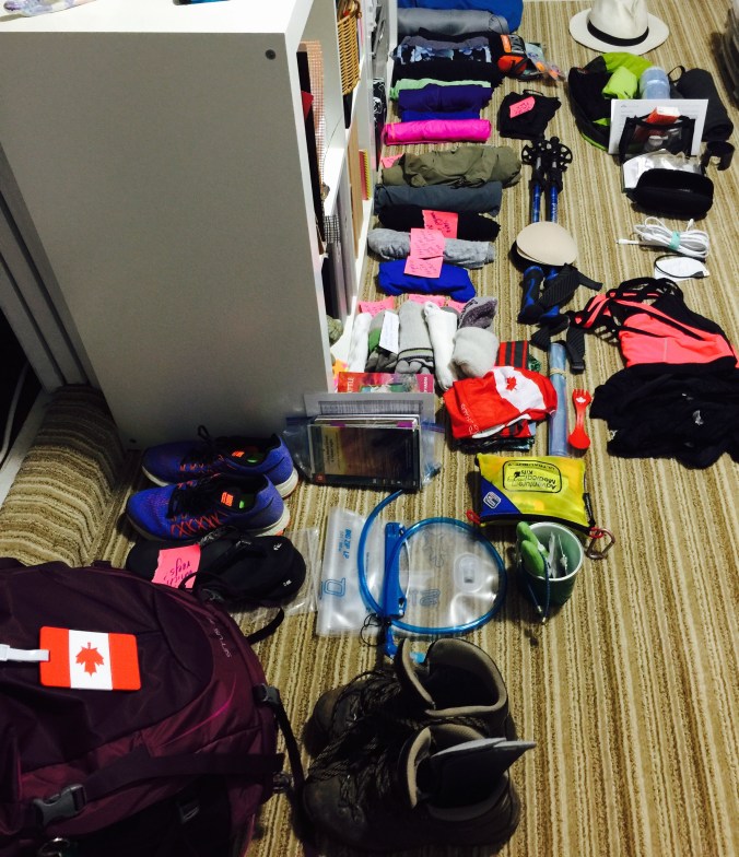 My scrapbook / craft studio has become a large display case for what will go in my backpack on Friday morning and for the next 36 sleeps after live on my back day to day, kilometer after kilometer. Everything is laid in a specific order (to me). Rolled where final decision has been made and that item is for sure coming – and only folded if I am unsure if its the “one” that gets to come with me. Post-it notes where I still need to grab the stuff from drawers or the laundry room or the drying rack.