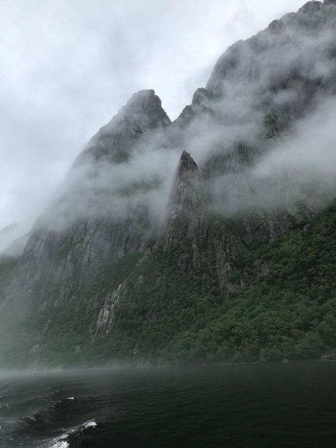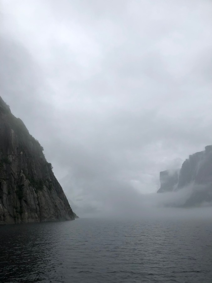 From there we headed to a boat tour which also included a hike – about 3km each way to the dock which made me happy! We had to race to the boat on the way out as we were cutting it tight and it was so worth hoofing it. The tour was $65/person for a 2hour of the fjords and I was keen to see the cliffs from the water! It was foggy as all heck but whatever the eeriness of fog on a boat we knew would still be so great!