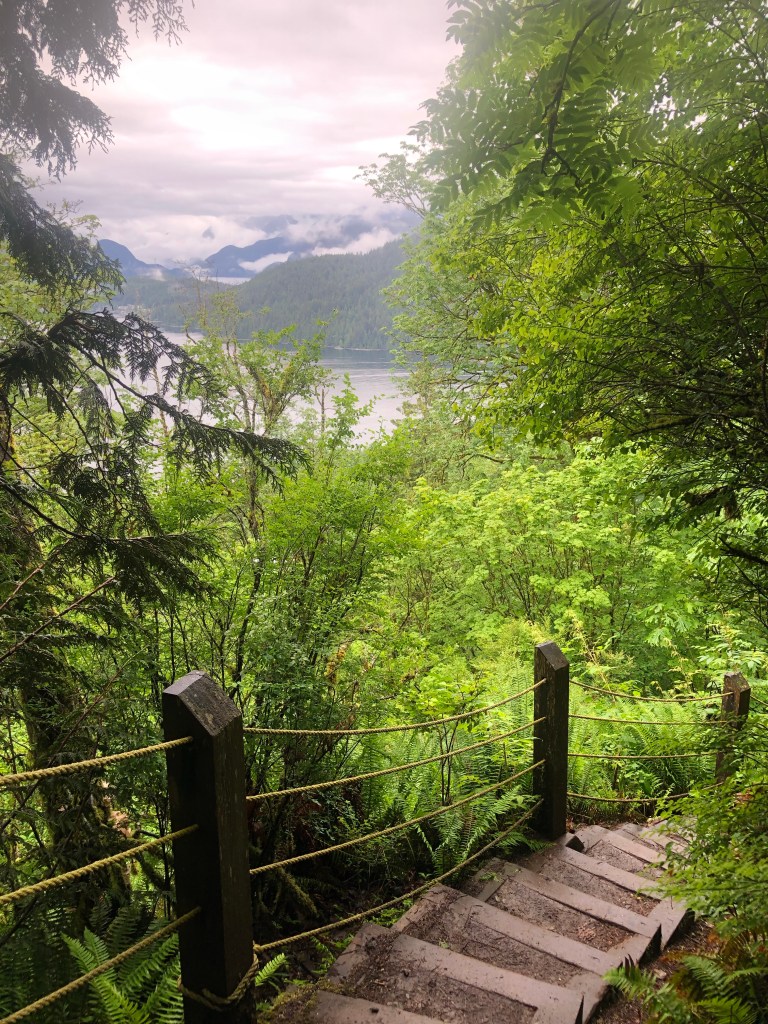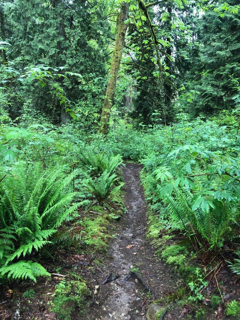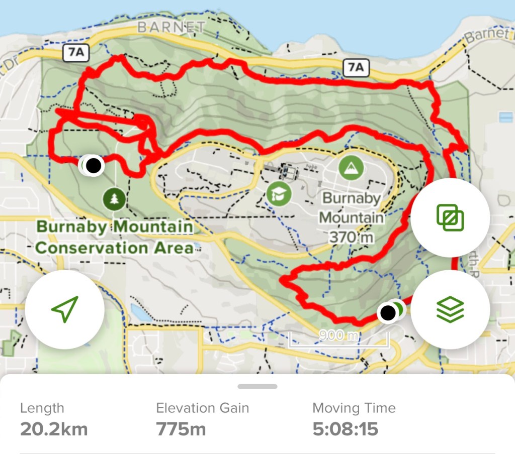 I picked a fantastic recorded trail on All Trails called Burnaby Mountain Tour – it promised the length I wanted (around 20km), a lot of elevation gain and loss, mucky messy trails, and rain! Yes, I purposely picked a day with a forecast of 100% rain so I could give the Gortex of my boots a go.