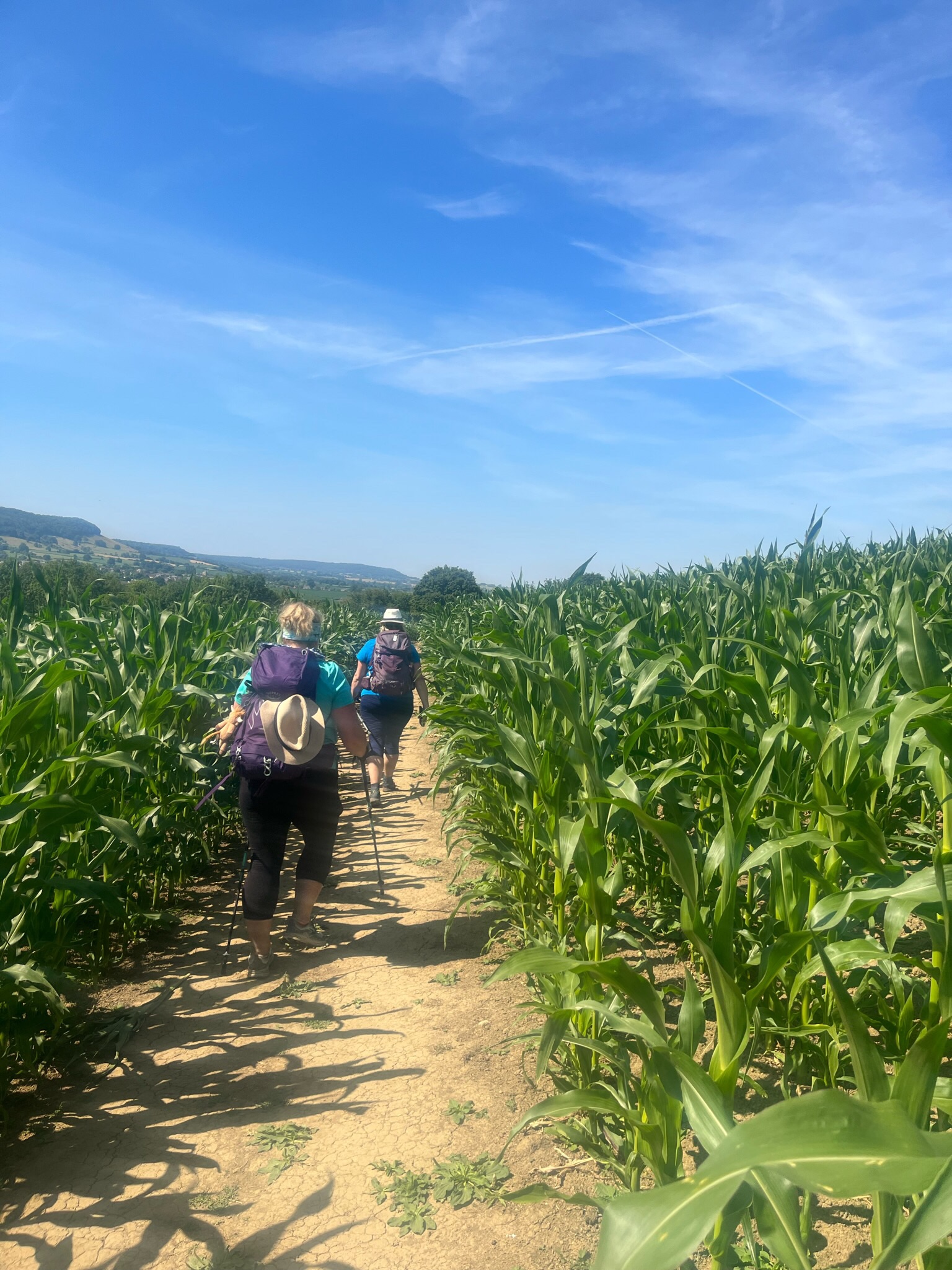 From there we crossed field after field of crops and livestock. One crop we had not seen yet was a field of, we think, Canola plants. They were head height and the field was so long it took us quite some time to get through – poor Cheryl was in the front of our pack on spider web clearing duty and her shoulders and arms were on fire by the time we came through. Thanks Cheryl!