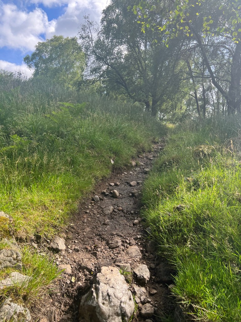 From the Bienglas Campsite, we headed up and back out of civilization again. Largely on wide track or some skinny sections up and over the hills through bracken and trail that had been turned to stream with the recent rain fall. All very easy walking if you kept a close eye on a sure spot for your foot!