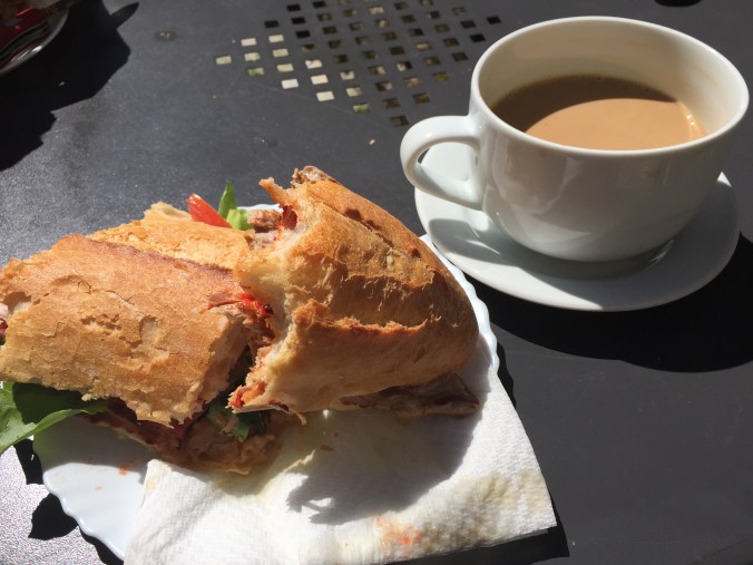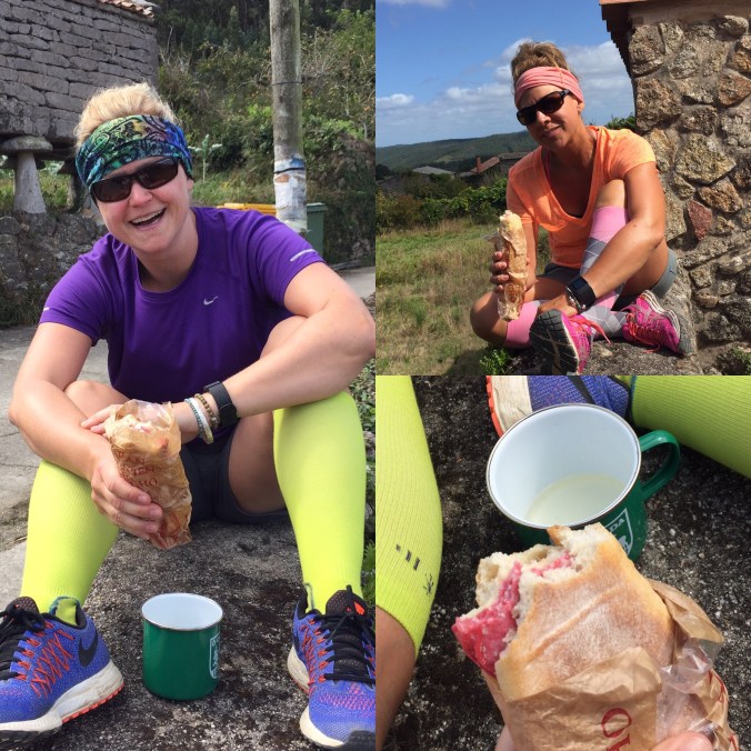 We stopped again around lunch (at about 9.5km into our 22km day) for a glass of wine and to eat the amazing sandwiches we had prepared the night prior. We had found a salad (quite literally) of the local Arzua cheese which is amazing creamy goodness – so added some meat and baguette for an awesome lunch!