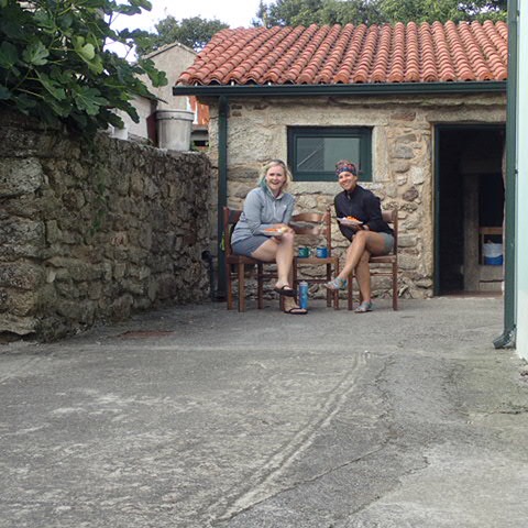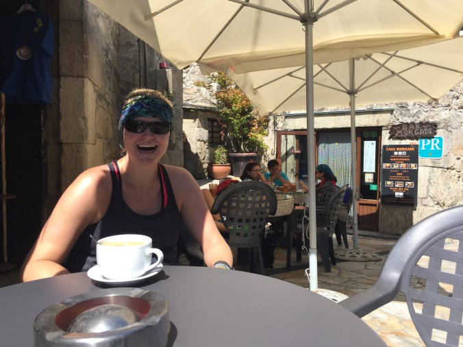 Why yes that post-hill selfie includes a vino blanco! After a hill like that we deserved a break and stopped in at a cafe called Poncho in the village of Transmonte. A wee, totally cute little cafe just 8km from our destination!