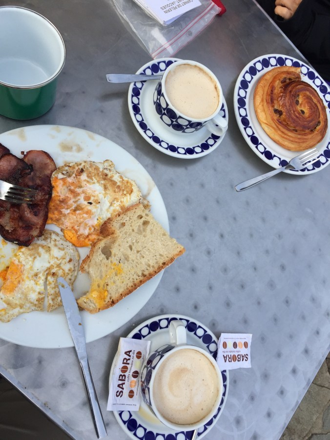 Around 1015am At the first awesome cafe we saw Casa Calzada in A Calzada (approx 9.4 km into the day) we popped in for our breakfast. It was only outside seating so we were super cold but a hot cafe con leche and breakfast tastes delicious no matter where and how! Mmmm