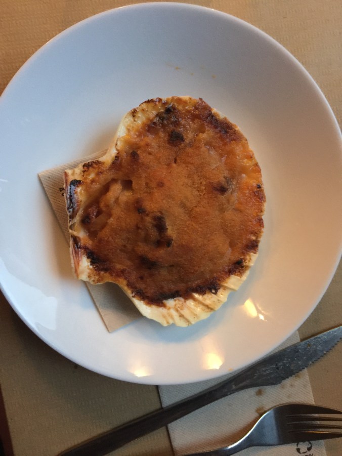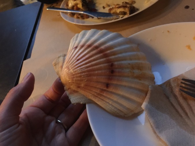 We went back to The Taste of the Way for dinner and enjoyed an awesome pilgrim’s meal with some local food choices. I could not resist trying the backed Scallop the Camino Way – the scallop shell is the symbol of the Camino. Delicious! Bread crumbs, cheese, ham and scallop.