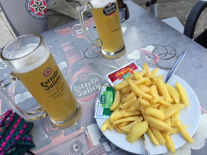 Finally at about 1230pm and 20km in we hit an awesome cafe called El Aleman in Boente. It was a great little place with lots of pilgrims and energy and the coldest, best tasting beer and vino blanco (white wine) we ever had – not to mention the fries!