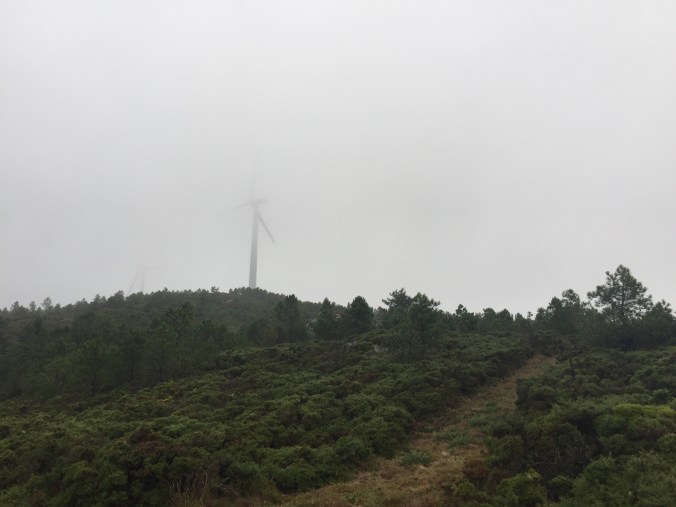 We were quickly out of our village and walking on a forest gravel road of sorts – up, down, across and up another river valley. The rain prevented much of a view and the fog hid the row of massive wind turbines that dot the ridge of the hills.