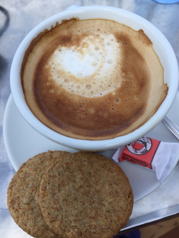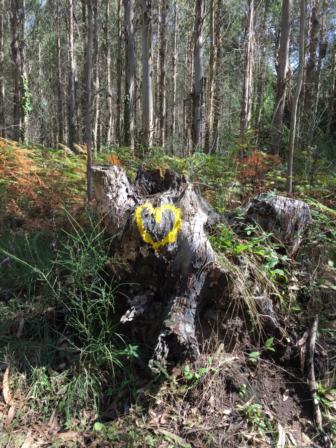 At about 12km into our day and around 12noon we came into a village called Lires. Here we stopped at a cafe called As Eiras for a cafe con leche to get us going for the last 18km. This would be the last village, cafe, water opportunity until we reached Muxia in another 18km. So we really, really enjoyed that coffee! I also particularly enjoyed it cause of the heart in my creamy foam!