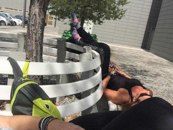 But first we had dinner … a red from the Rioja region (thanks Lana for the intro to this amazing Spanish wine region) opened with a cheap plastic hotel corkscrew, salad out of a bag, meat we opened with our first-aid kit scissors, all served on a city map of Leon as our placemat / cutting board / plate.