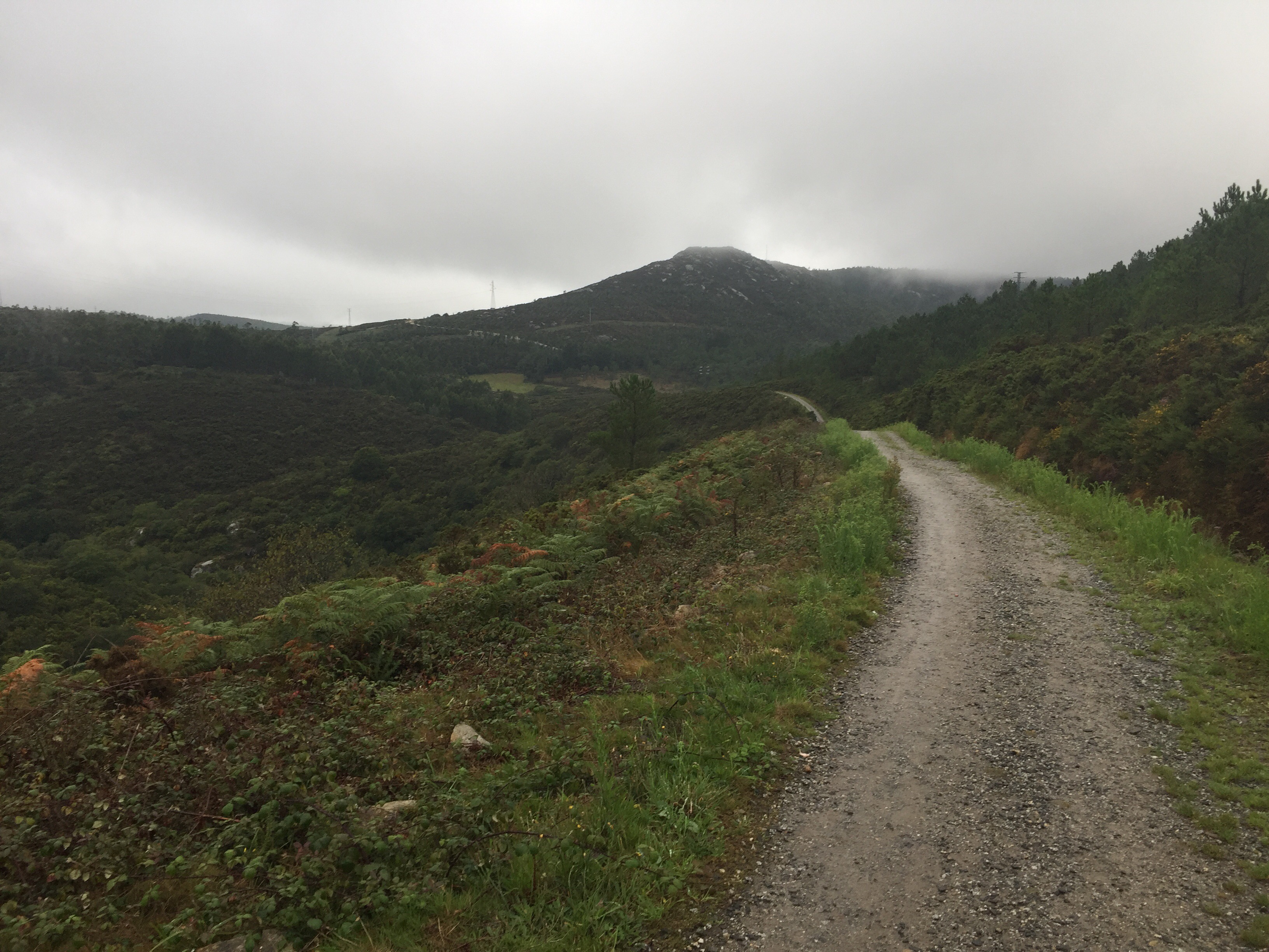 We were quickly out of our village and walking on a forest gravel road of sorts – up, down, across and up another river valley. The rain prevented much of a view and the fog hid the row of massive wind turbines that dot the ridge of the hills.