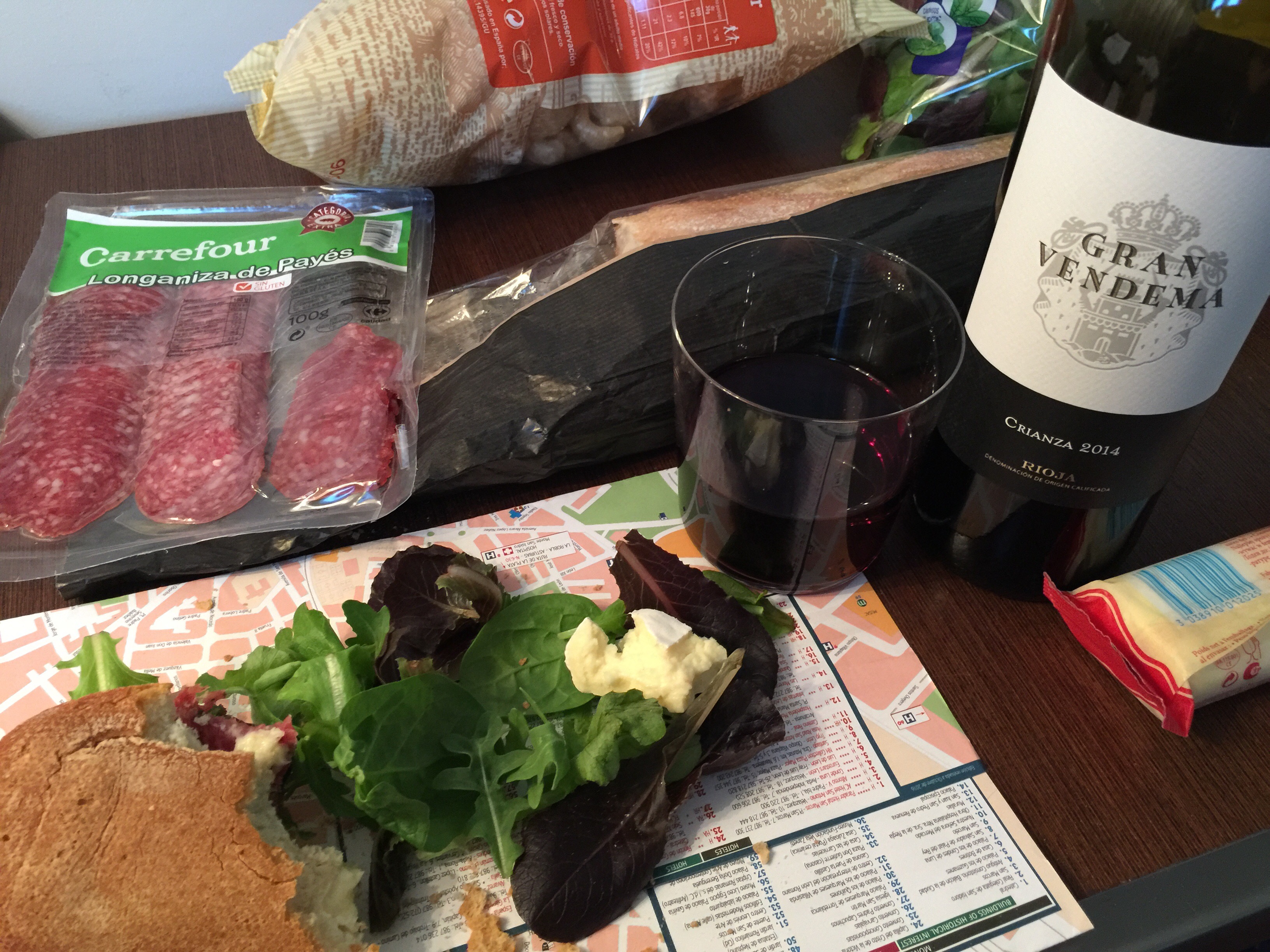 But first we had dinner … a red from the Rioja region (thanks Lana for the intro to this amazing Spanish wine region) opened with a cheap plastic hotel corkscrew, salad out of a bag, meat we opened with our first-aid kit scissors, all served on a city map of Leon as our placemat / cutting board / plate.