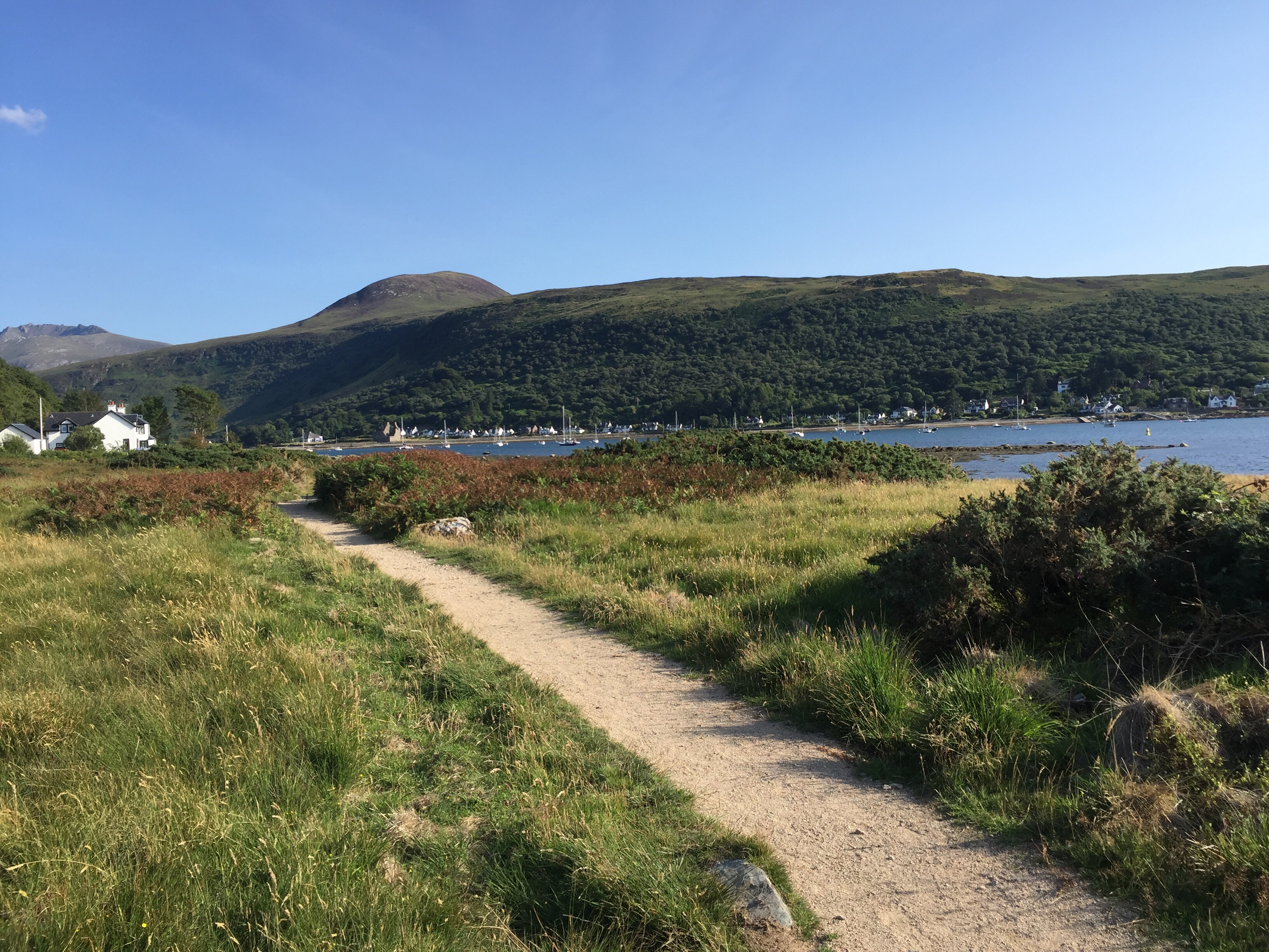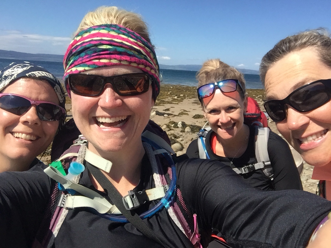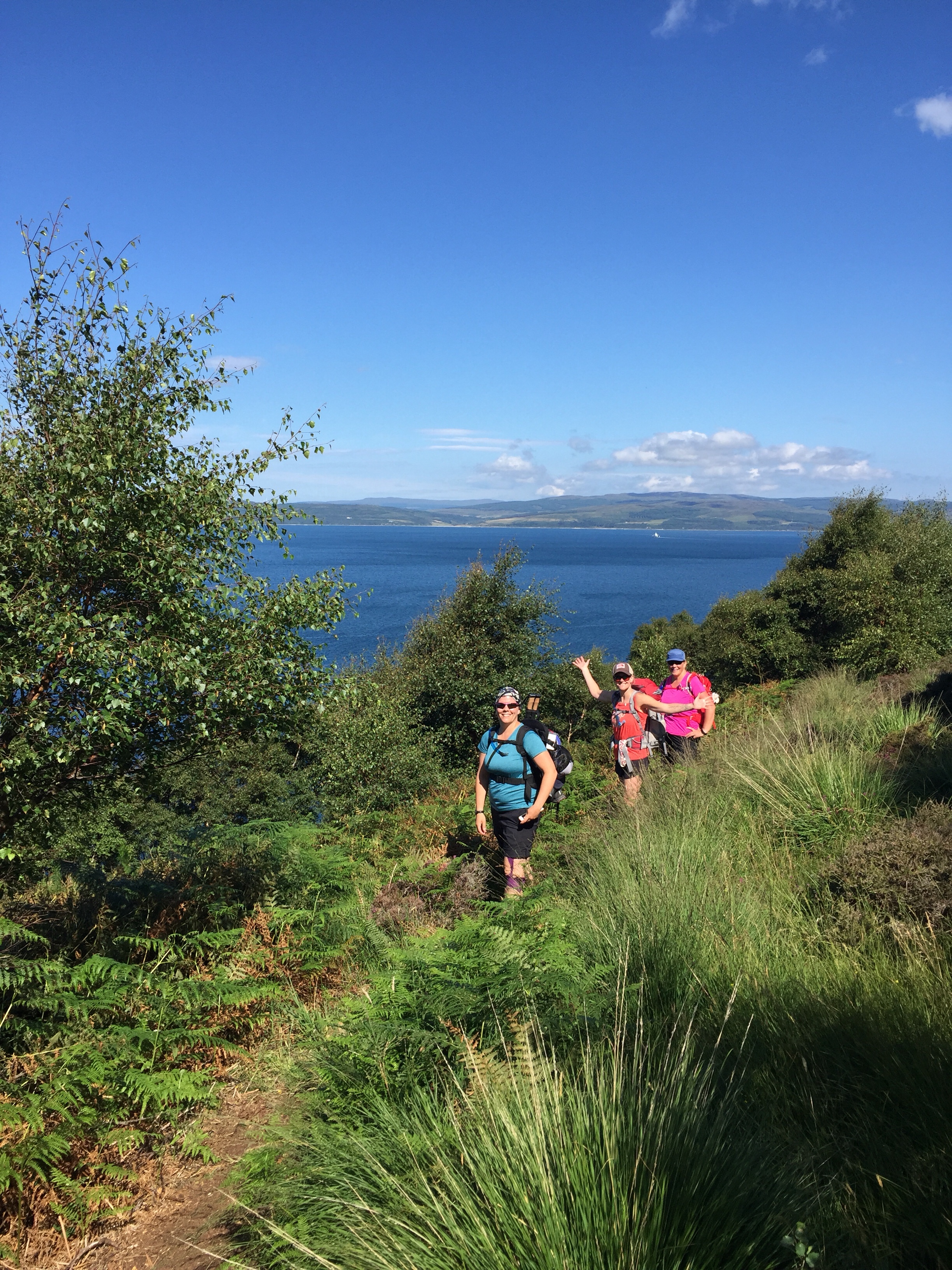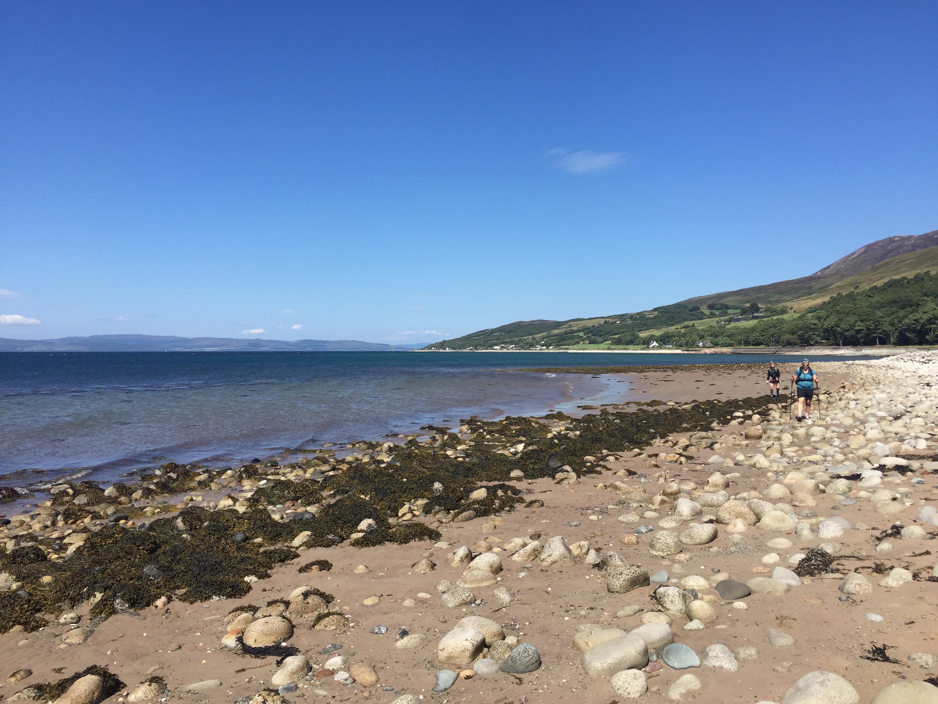 Today was quite the Arran Coastal Way kick off … perhaps a little trial of fire really with such high temperatures, 27km distance, bouldering, beach walking, hill climbing and wardrobe malfunctions. Amazing every step of it, wow what an experience. We began our day with a yummy continental breakfast at our B&B, The Broomage, after a decent night’s sleep. Most of us were up a few times in the night – our brains refusing to adjust too quickly to Scots time from west coast Canada time but we felt rested and ready all the same. Breaky in, water bladders full, and packs on we headed out the door to start our walk – there may have even been some high 5s! We headed to the start of the trail which is marked with a really cool map of Arran on this big stone slab thing – I am not doing it justice with that description haha! The day started with a walk along the path, boardwalk and across the beach around the Brodick Harbour. Easy walking makes for such nice start to the day – lots of good conversation and a good way to get the muscles warmed up.From there we progressed from beach to forested path. Now we are talking! This is the kind of walking I love – in the trees, shaded from the sun, lots of up and down and stepping over roots and across little streams. We were still feeling amazing! Once through the forested section, we arrived in Corrie & Sannox a string of small villages along the coast. This had us walking on the road for a few kms and gave us a chance to stop for a wee spot of tea and some cookies! From there we were off for a bit more road walking and then refreshingly back to coast line. About an hour or so later we stopped for a sea side picnic, boots off to give the toes a break and some air, some more sunscreen and we were off again. The afternoon was much tougher that the morning but wow was it amazing. We were back on the coast but now this was a rough coastline with loads of scrambling or bouldering – the views were amazing and the terrain fun to walk but this is the type of trail that’s hard on the body and oh I love it. But wow those random moments of flat terrain were such a welcome break for the tired ankles!Wow – after 10 hours of hiking, a total of 53,640 steps and 4,939 calories we finally arrived in the cutest little coastal town of Lochranza. This town could not have come sooner – we were tired! Some of us switched from boots to shoes to give the feet a break and all of us enjoyed a few Haribo chewy candies (coke bottles, fried eggs and such) for a boost for the last couple of kms. Mmm Once in Lochranza, we headed straight to the Lochranza Hotel. The only place you can get food in town and only until 830pm (and it was already 7pm). The gulp of that cold pint was a dream! Oh like you have no idea – too good. We had a yummy dinner out on the hotel lawn at a picnic table with with views of the old Lochranza Castle across the harbour. You could tell we were tired, loads of giggles and laughing till we cry moments! Best finish ever to an awesome day!BrandePS for the Outlander fans out there … despite multiple attempts, Rosa has not yet heard the buzzing of bees. No worries though, our scientific endeavour to find Jamie Fraser will continue!