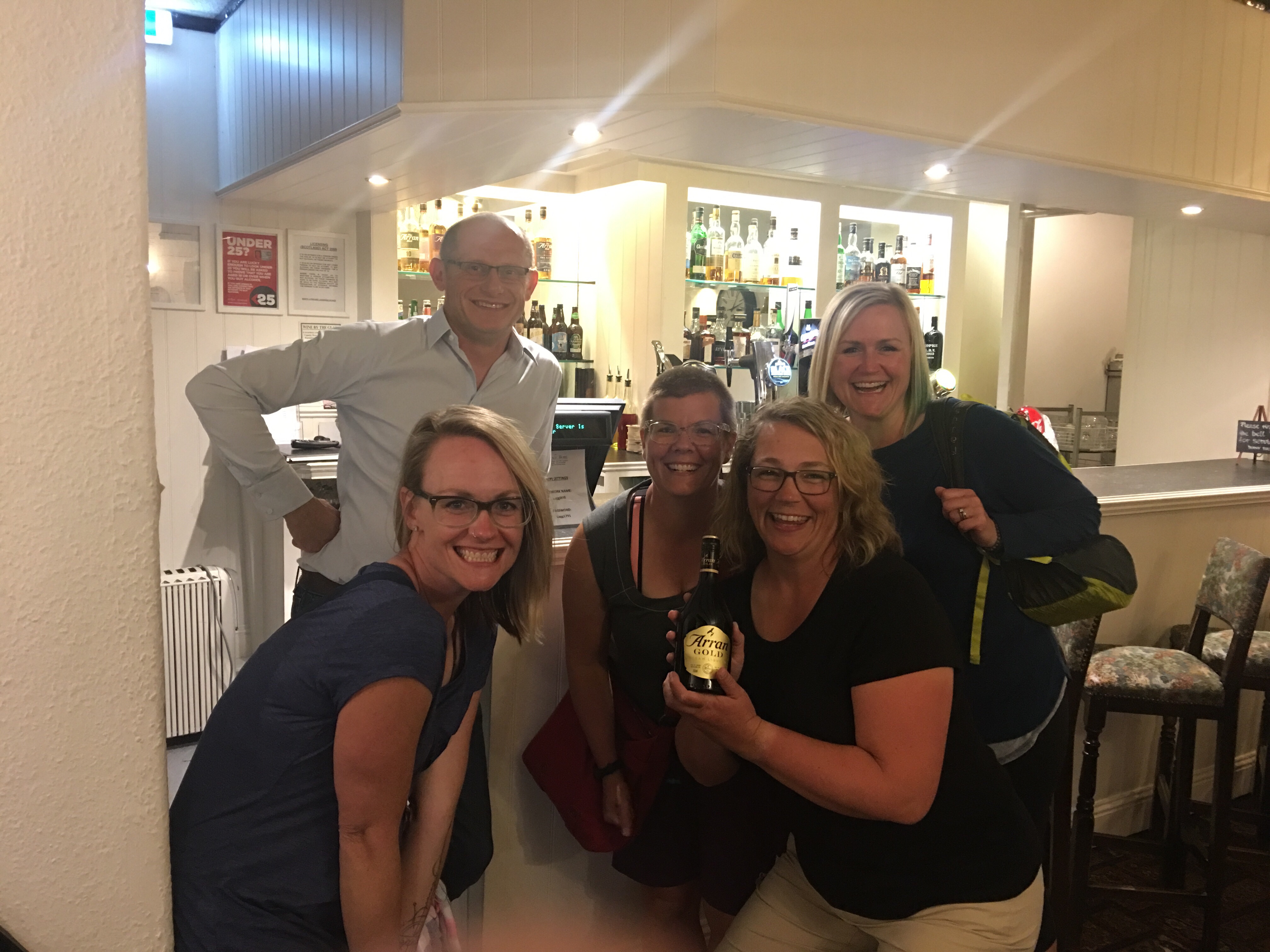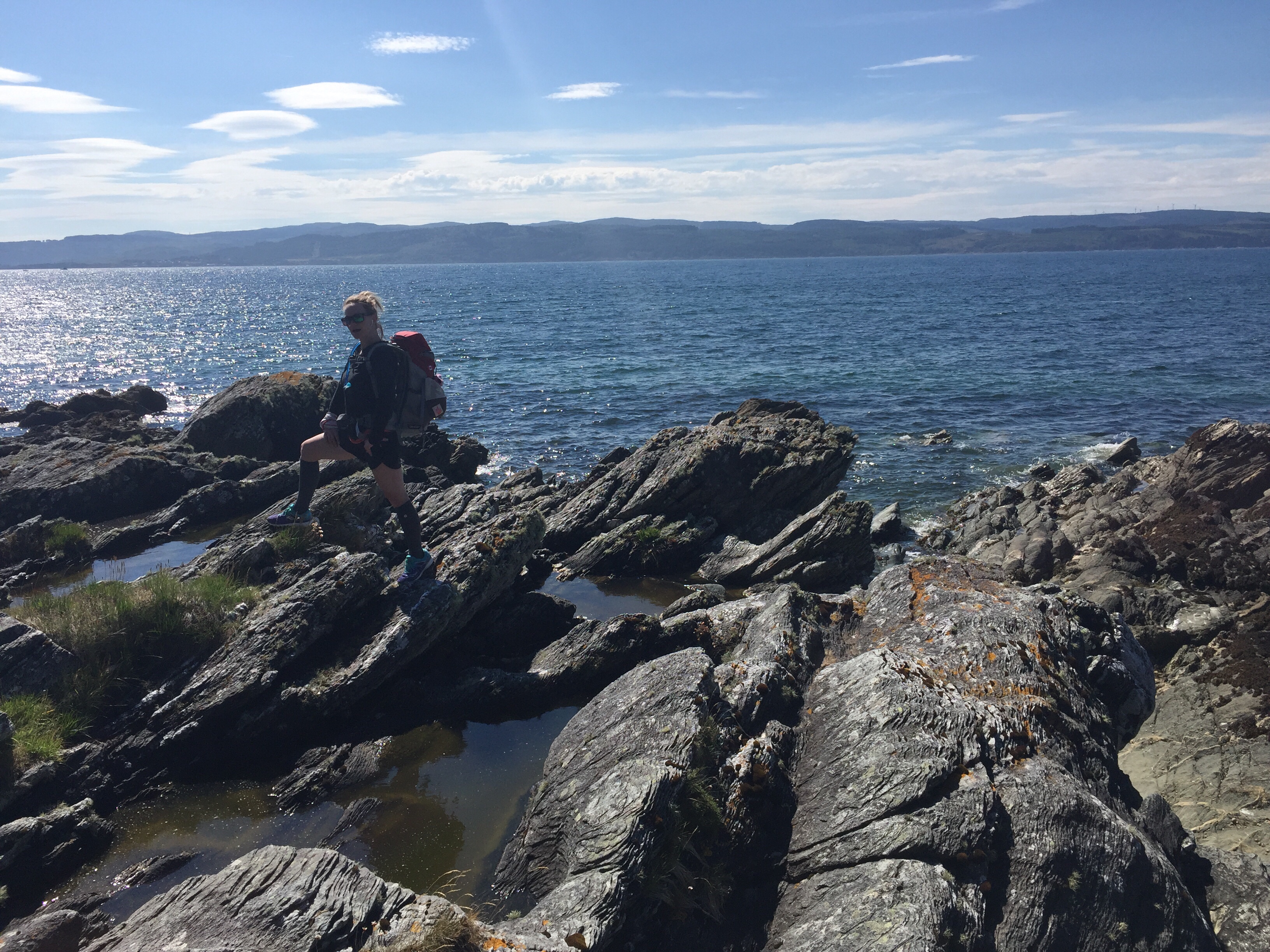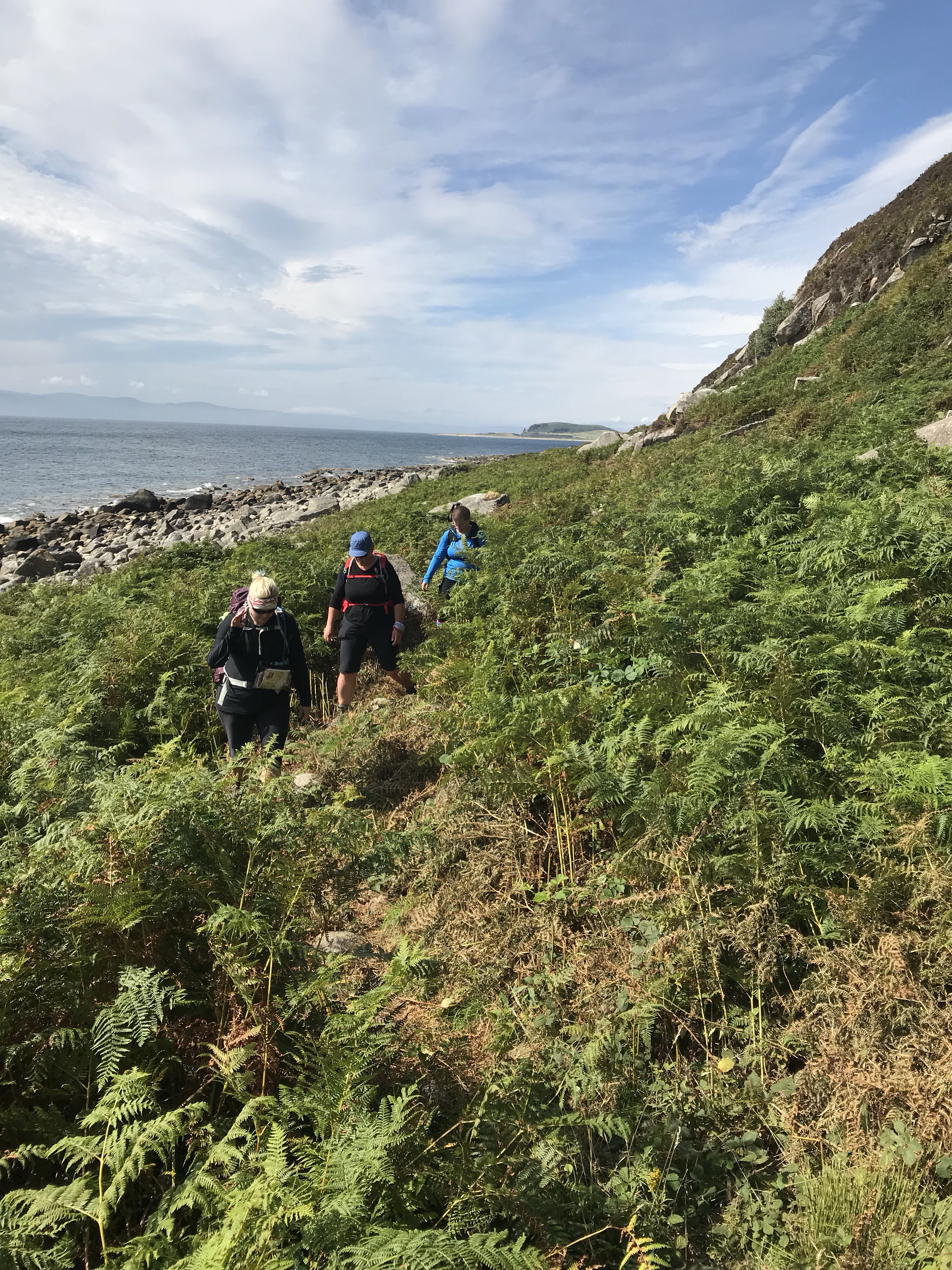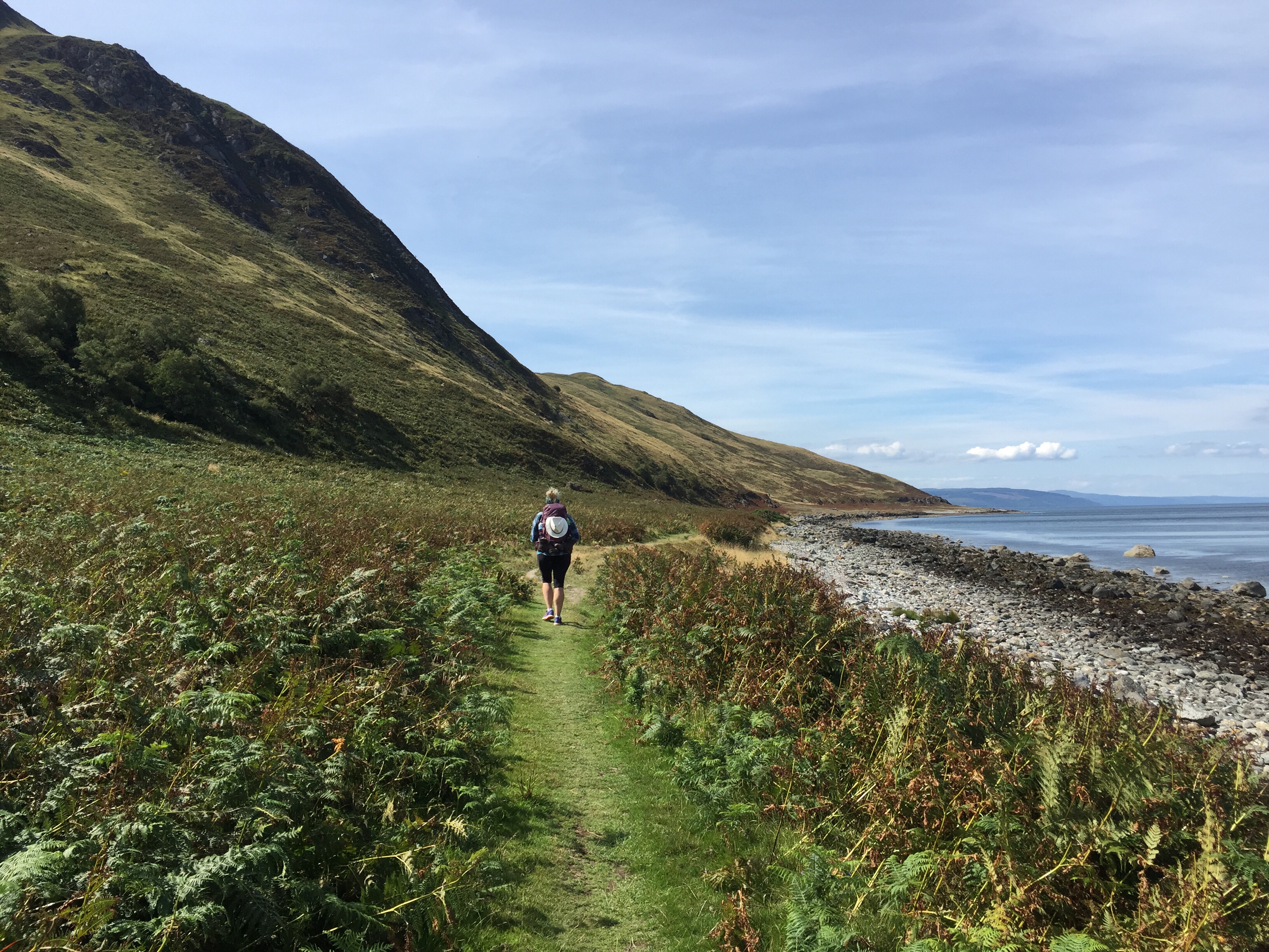Today was quite the Arran Coastal Way kick off … perhaps a little trial of fire really with such high temperatures, 27km distance, bouldering, beach walking, hill climbing and wardrobe malfunctions. Amazing every step of it, wow what an experience. We began our day with a yummy continental breakfast at our B&B, The Broomage, after a decent night’s sleep. Most of us were up a few times in the night – our brains refusing to adjust too quickly to Scots time from west coast Canada time but we felt rested and ready all the same. Breaky in, water bladders full, and packs on we headed out the door to start our walk – there may have even been some high 5s! We headed to the start of the trail which is marked with a really cool map of Arran on this big stone slab thing – I am not doing it justice with that description haha! The day started with a walk along the path, boardwalk and across the beach around the Brodick Harbour. Easy walking makes for such nice start to the day – lots of good conversation and a good way to get the muscles warmed up.From there we progressed from beach to forested path. Now we are talking! This is the kind of walking I love – in the trees, shaded from the sun, lots of up and down and stepping over roots and across little streams. We were still feeling amazing! Once through the forested section, we arrived in Corrie & Sannox a string of small villages along the coast. This had us walking on the road for a few kms and gave us a chance to stop for a wee spot of tea and some cookies! From there we were off for a bit more road walking and then refreshingly back to coast line. About an hour or so later we stopped for a sea side picnic, boots off to give the toes a break and some air, some more sunscreen and we were off again. The afternoon was much tougher that the morning but wow was it amazing. We were back on the coast but now this was a rough coastline with loads of scrambling or bouldering – the views were amazing and the terrain fun to walk but this is the type of trail that’s hard on the body and oh I love it. But wow those random moments of flat terrain were such a welcome break for the tired ankles!Wow – after 10 hours of hiking, a total of 53,640 steps and 4,939 calories we finally arrived in the cutest little coastal town of Lochranza. This town could not have come sooner – we were tired! Some of us switched from boots to shoes to give the feet a break and all of us enjoyed a few Haribo chewy candies (coke bottles, fried eggs and such) for a boost for the last couple of kms. Mmm Once in Lochranza, we headed straight to the Lochranza Hotel. The only place you can get food in town and only until 830pm (and it was already 7pm). The gulp of that cold pint was a dream! Oh like you have no idea – too good. We had a yummy dinner out on the hotel lawn at a picnic table with with views of the old Lochranza Castle across the harbour. You could tell we were tired, loads of giggles and laughing till we cry moments! Best finish ever to an awesome day!BrandePS for the Outlander fans out there … despite multiple attempts, Rosa has not yet heard the buzzing of bees. No worries though, our scientific endeavour to find Jamie Fraser will continue!