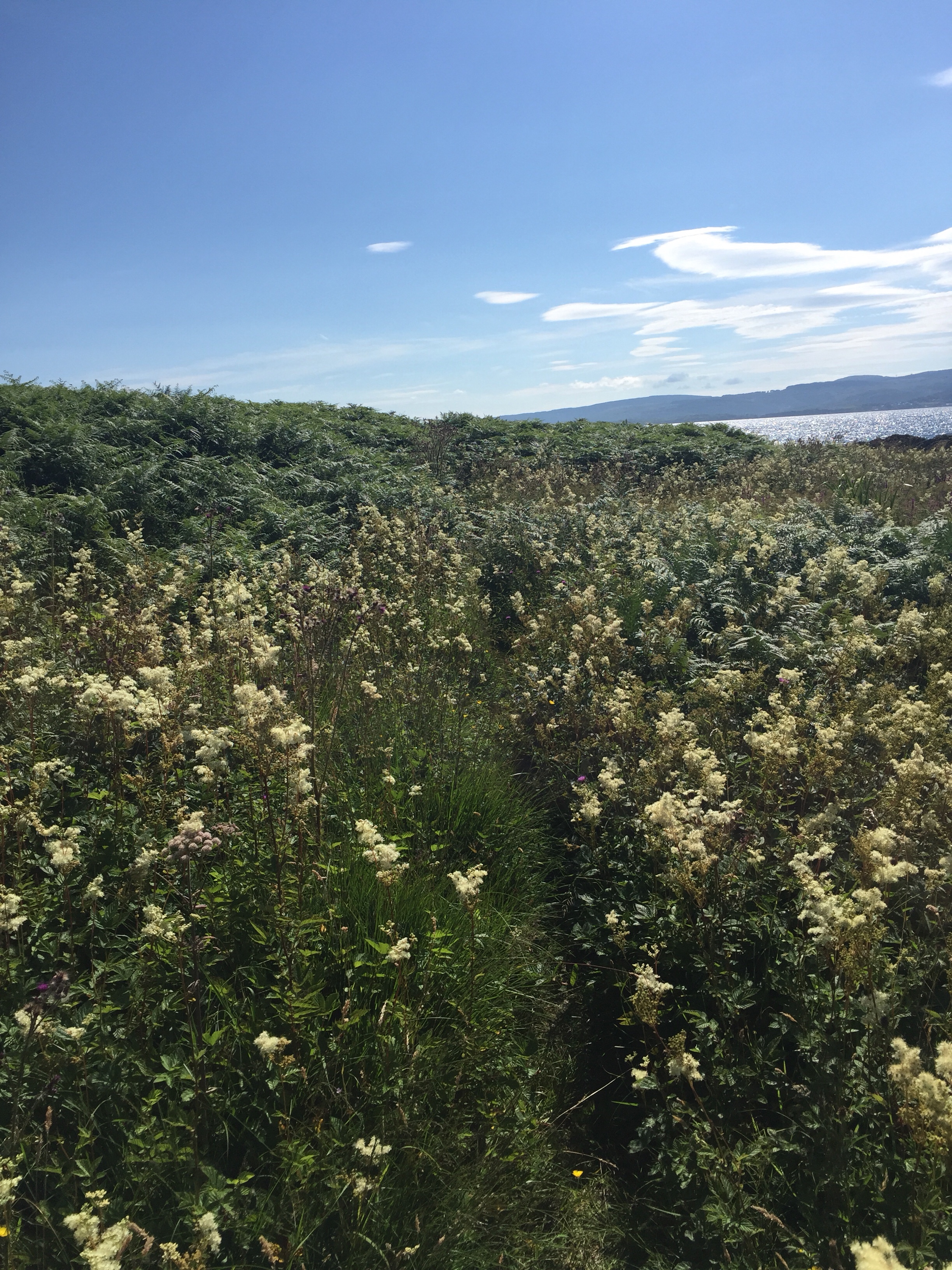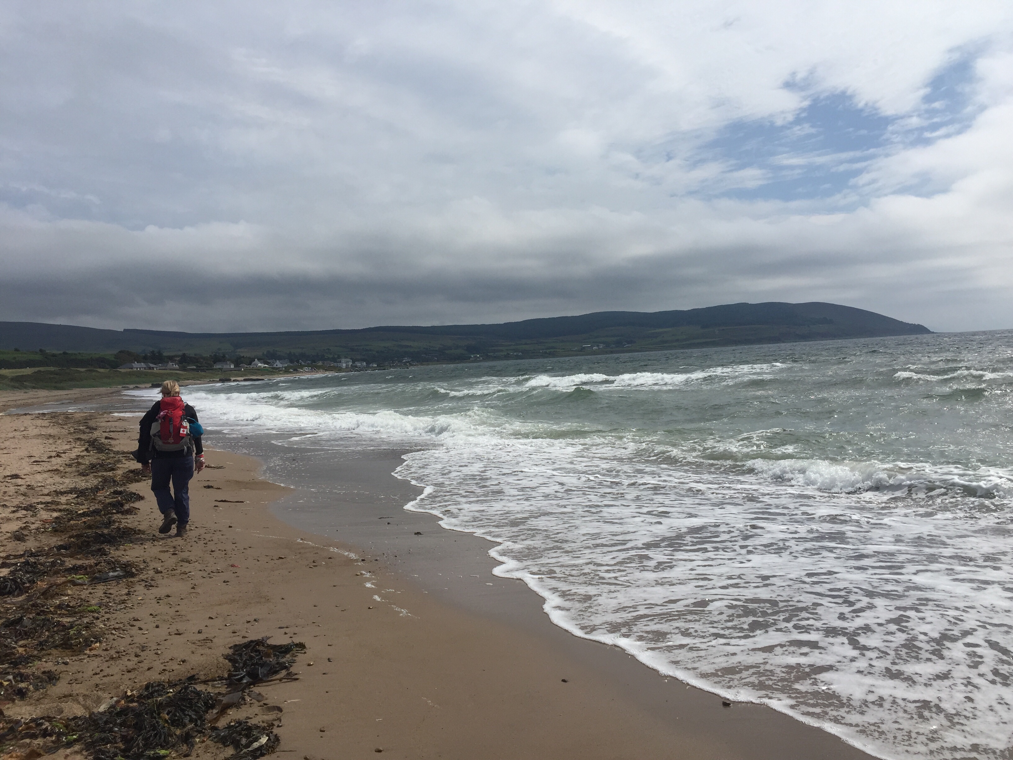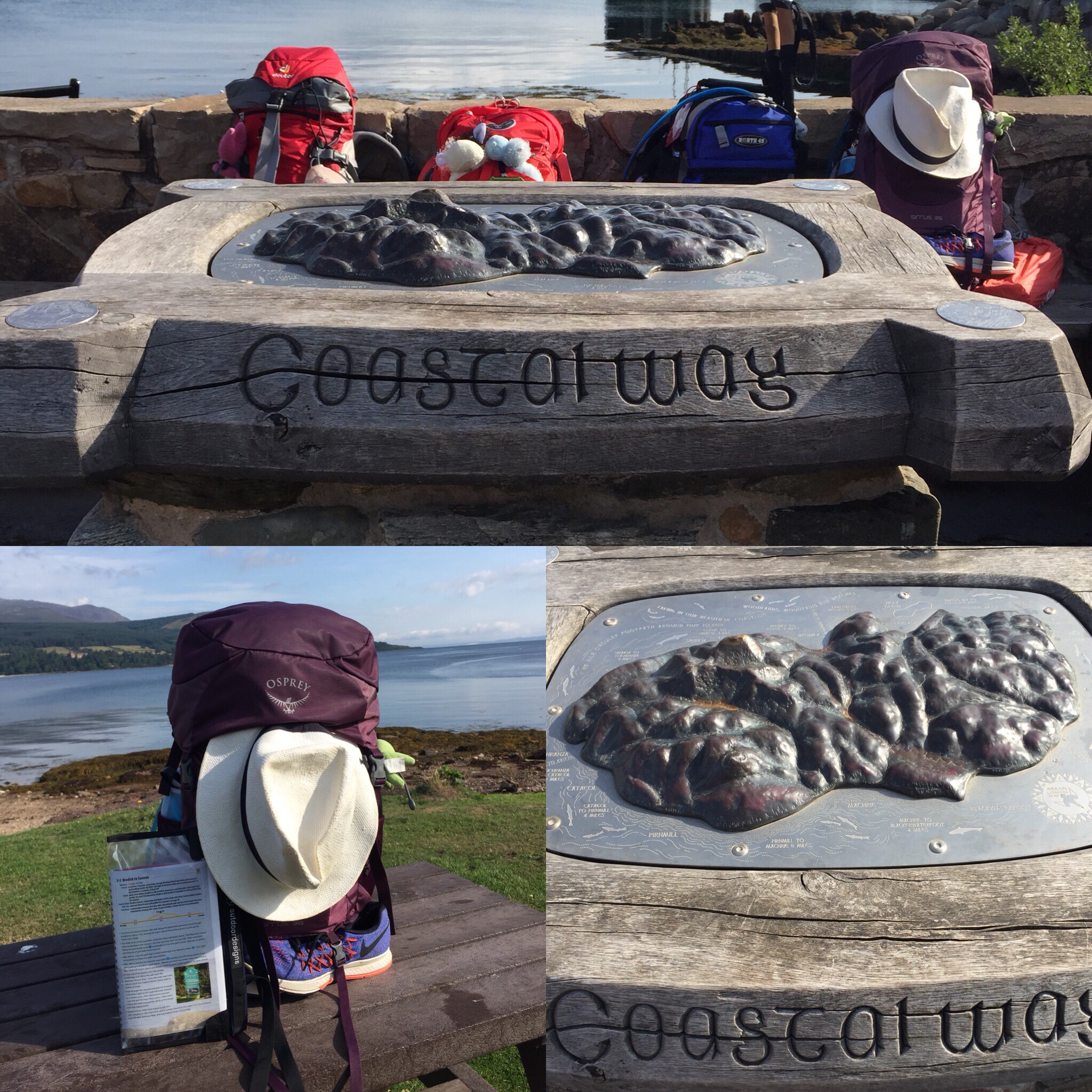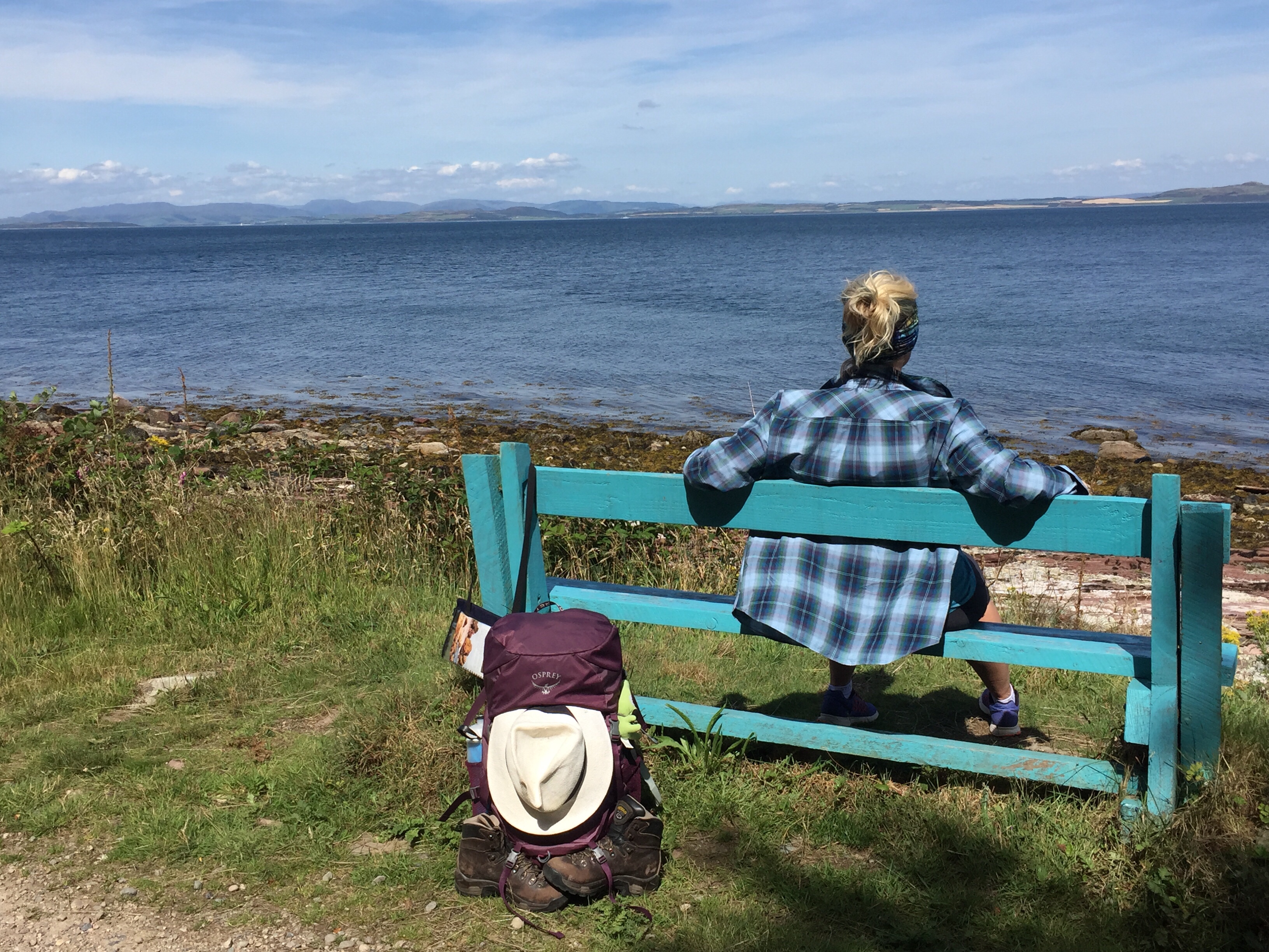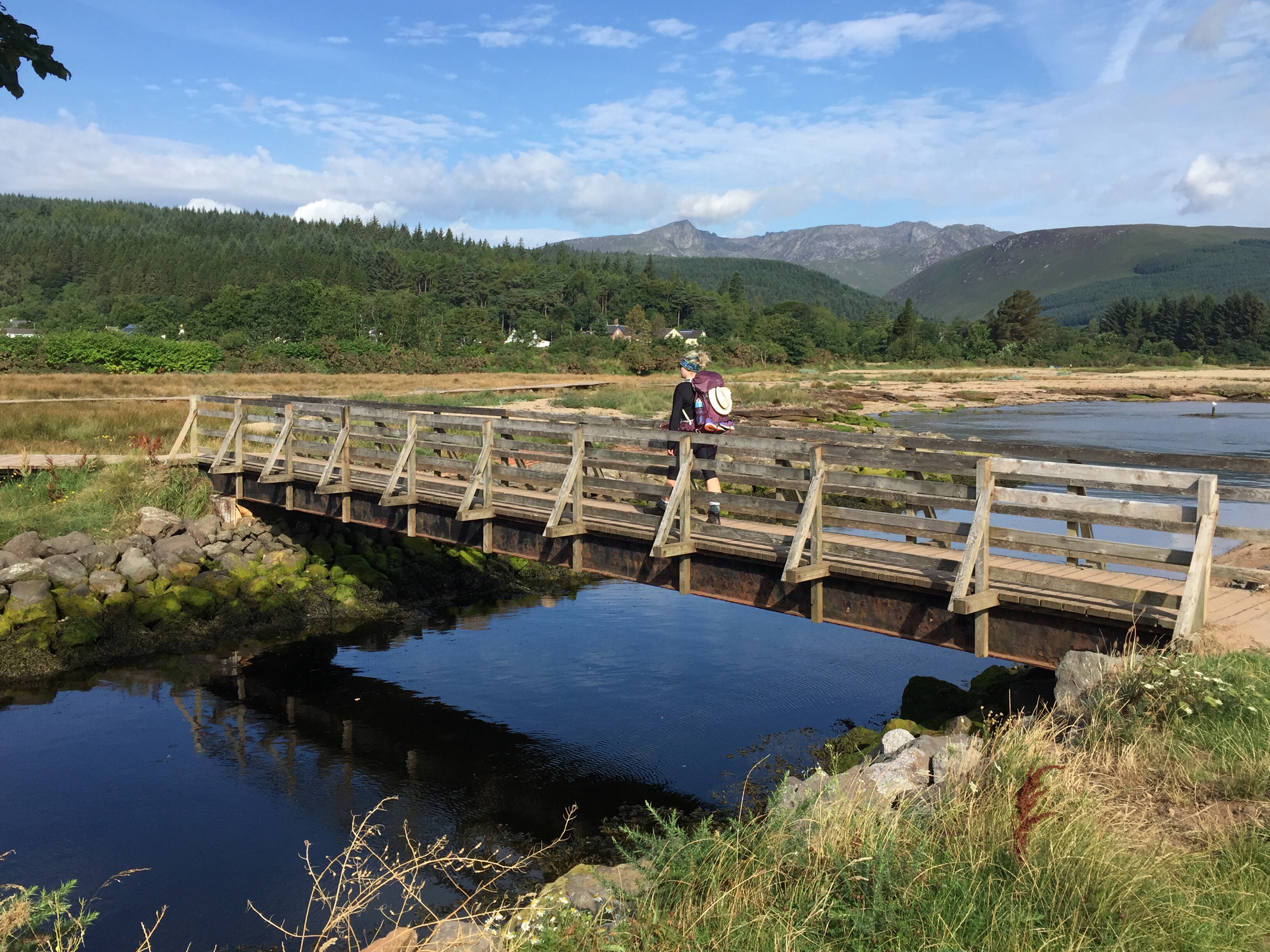 Today was quite the Arran Coastal Way kick off … perhaps a little trial of fire really with such high temperatures, 27km distance, bouldering, beach walking, hill climbing and wardrobe malfunctions. Amazing every step of it, wow what an experience. We began our day with a yummy continental breakfast at our B&B, The Broomage, after a decent night’s sleep. Most of us were up a few times in the night – our brains refusing to adjust too quickly to Scots time from west coast Canada time but we felt rested and ready all the same. Breaky in, water bladders full, and packs on we headed out the door to start our walk – there may have even been some high 5s! We headed to the start of the trail which is marked with a really cool map of Arran on this big stone slab thing – I am not doing it justice with that description haha! The day started with a walk along the path, boardwalk and across the beach around the Brodick Harbour. Easy walking makes for such nice start to the day – lots of good conversation and a good way to get the muscles warmed up.From there we progressed from beach to forested path. Now we are talking! This is the kind of walking I love – in the trees, shaded from the sun, lots of up and down and stepping over roots and across little streams. We were still feeling amazing! Once through the forested section, we arrived in Corrie & Sannox a string of small villages along the coast. This had us walking on the road for a few kms and gave us a chance to stop for a wee spot of tea and some cookies! From there we were off for a bit more road walking and then refreshingly back to coast line. About an hour or so later we stopped for a sea side picnic, boots off to give the toes a break and some air, some more sunscreen and we were off again. The afternoon was much tougher that the morning but wow was it amazing. We were back on the coast but now this was a rough coastline with loads of scrambling or bouldering – the views were amazing and the terrain fun to walk but this is the type of trail that’s hard on the body and oh I love it. But wow those random moments of flat terrain were such a welcome break for the tired ankles!Wow – after 10 hours of hiking, a total of 53,640 steps and 4,939 calories we finally arrived in the cutest little coastal town of Lochranza. This town could not have come sooner – we were tired! Some of us switched from boots to shoes to give the feet a break and all of us enjoyed a few Haribo chewy candies (coke bottles, fried eggs and such) for a boost for the last couple of kms. Mmm Once in Lochranza, we headed straight to the Lochranza Hotel. The only place you can get food in town and only until 830pm (and it was already 7pm). The gulp of that cold pint was a dream! Oh like you have no idea – too good. We had a yummy dinner out on the hotel lawn at a picnic table with with views of the old Lochranza Castle across the harbour. You could tell we were tired, loads of giggles and laughing till we cry moments! Best finish ever to an awesome day!BrandePS for the Outlander fans out there … despite multiple attempts, Rosa has not yet heard the buzzing of bees. No worries though, our scientific endeavour to find Jamie Fraser will continue!