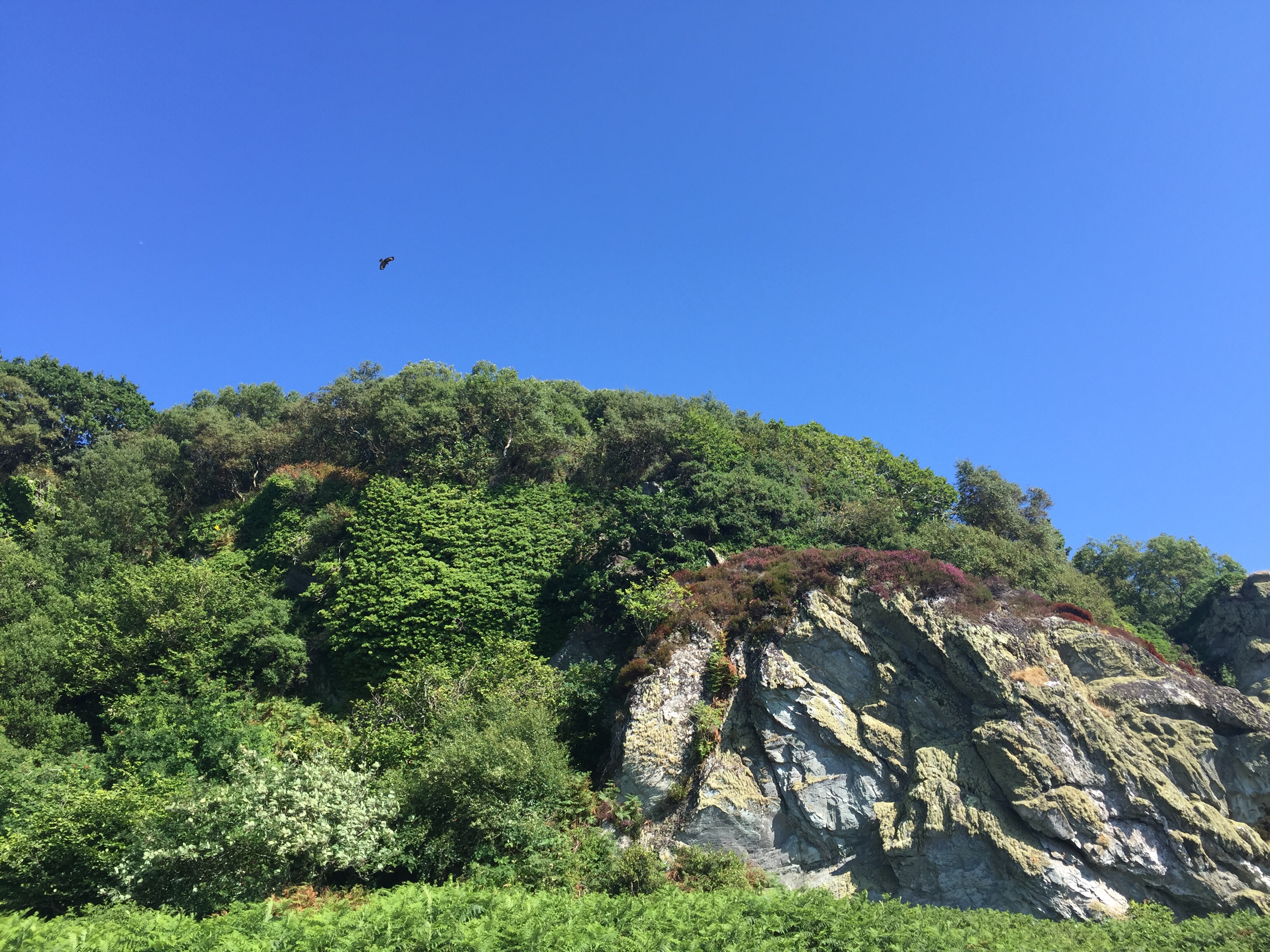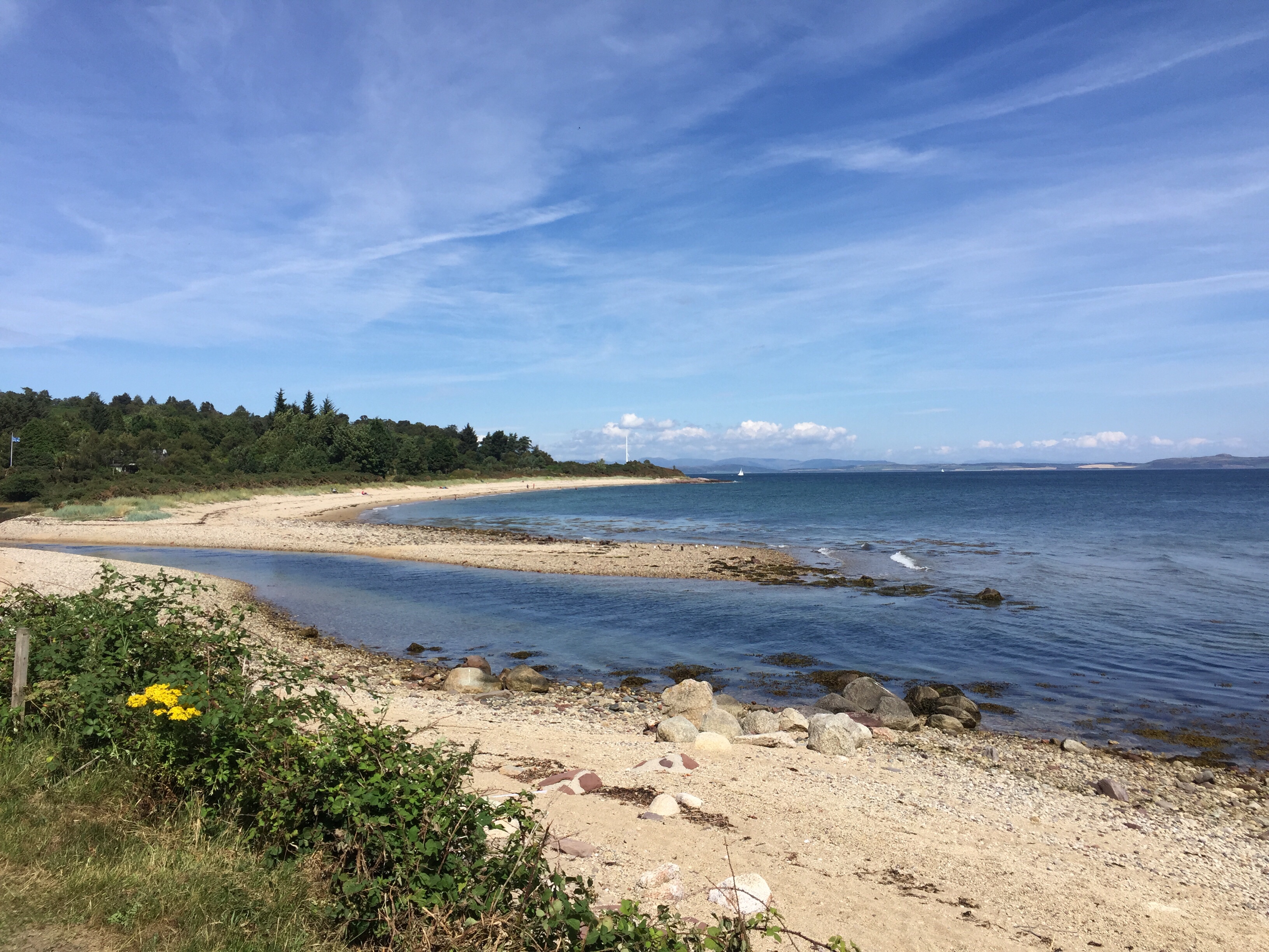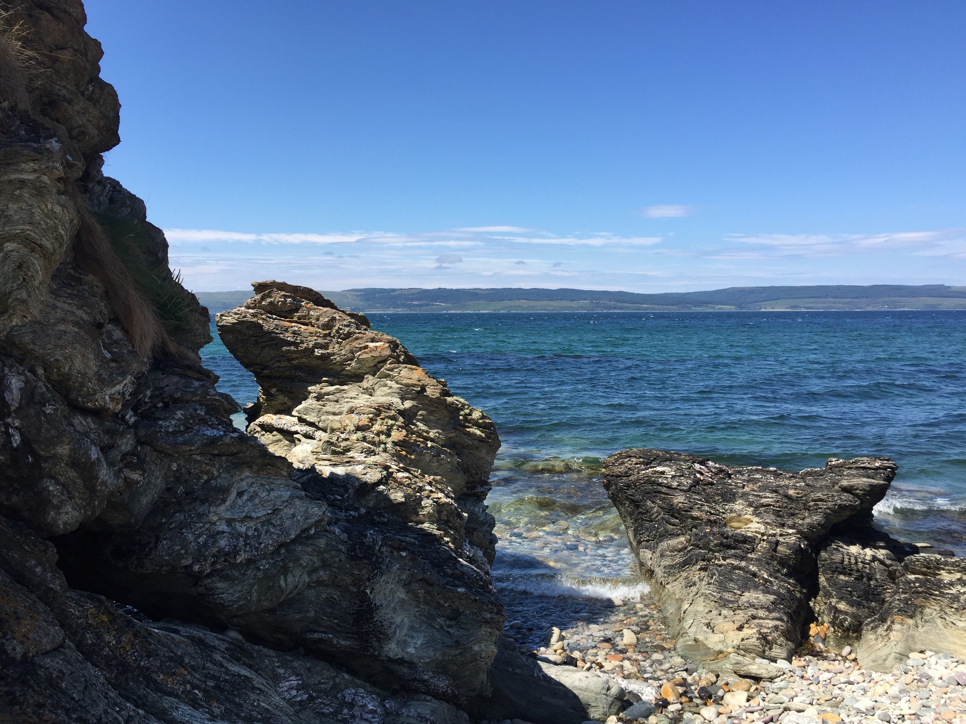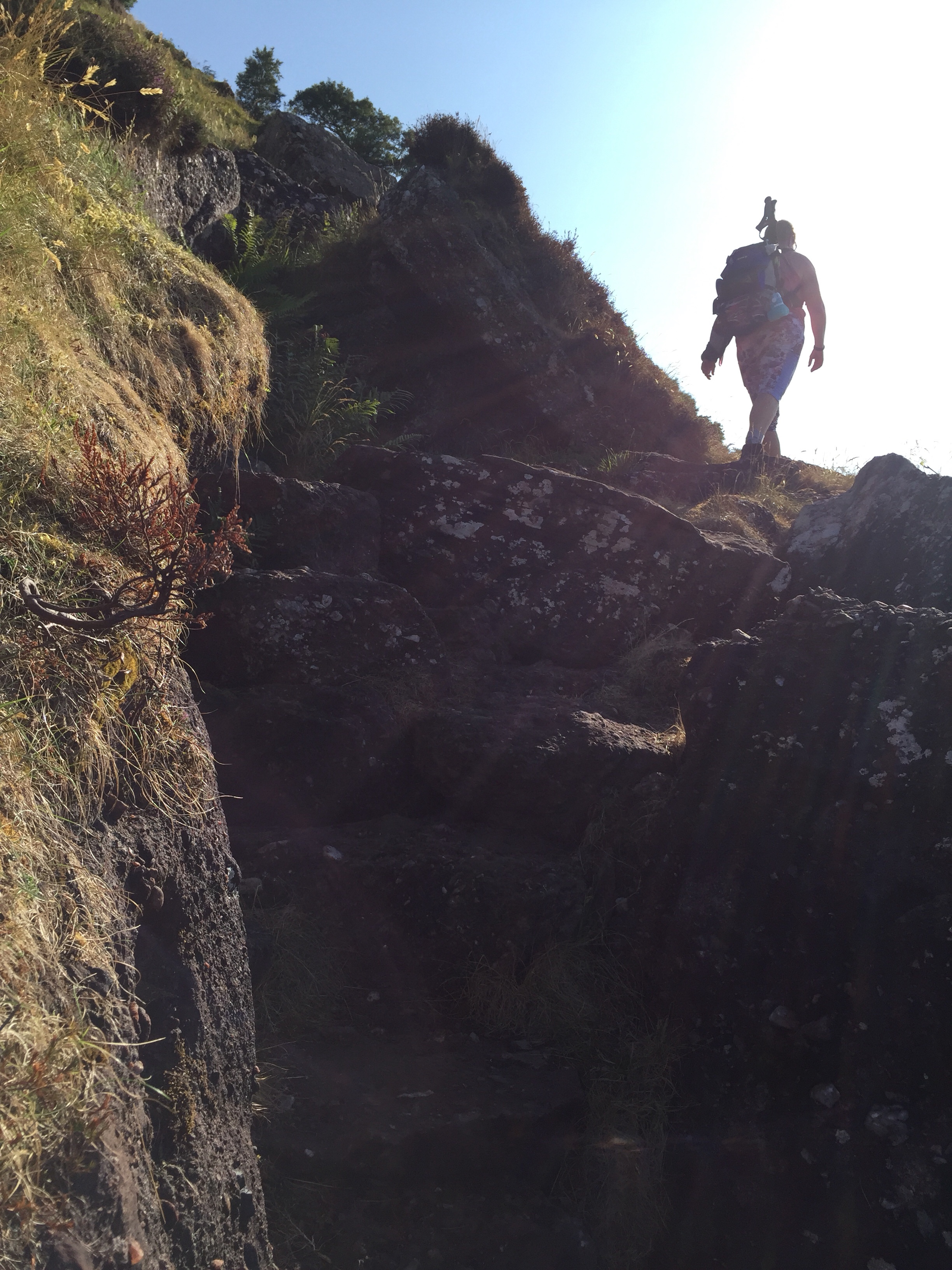 Today was quite the Arran Coastal Way kick off … perhaps a little trial of fire really with such high temperatures, 27km distance, bouldering, beach walking, hill climbing and wardrobe malfunctions. Amazing every step of it, wow what an experience. We began our day with a yummy continental breakfast at our B&B, The Broomage, after a decent night’s sleep. Most of us were up a few times in the night – our brains refusing to adjust too quickly to Scots time from west coast Canada time but we felt rested and ready all the same. Breaky in, water bladders full, and packs on we headed out the door to start our walk – there may have even been some high 5s! We headed to the start of the trail which is marked with a really cool map of Arran on this big stone slab thing – I am not doing it justice with that description haha! The day started with a walk along the path, boardwalk and across the beach around the Brodick Harbour. Easy walking makes for such nice start to the day – lots of good conversation and a good way to get the muscles warmed up.From there we progressed from beach to forested path. Now we are talking! This is the kind of walking I love – in the trees, shaded from the sun, lots of up and down and stepping over roots and across little streams. We were still feeling amazing! Once through the forested section, we arrived in Corrie & Sannox a string of small villages along the coast. This had us walking on the road for a few kms and gave us a chance to stop for a wee spot of tea and some cookies! From there we were off for a bit more road walking and then refreshingly back to coast line. About an hour or so later we stopped for a sea side picnic, boots off to give the toes a break and some air, some more sunscreen and we were off again. The afternoon was much tougher that the morning but wow was it amazing. We were back on the coast but now this was a rough coastline with loads of scrambling or bouldering – the views were amazing and the terrain fun to walk but this is the type of trail that’s hard on the body and oh I love it. But wow those random moments of flat terrain were such a welcome break for the tired ankles!Wow – after 10 hours of hiking, a total of 53,640 steps and 4,939 calories we finally arrived in the cutest little coastal town of Lochranza. This town could not have come sooner – we were tired! Some of us switched from boots to shoes to give the feet a break and all of us enjoyed a few Haribo chewy candies (coke bottles, fried eggs and such) for a boost for the last couple of kms. Mmm Once in Lochranza, we headed straight to the Lochranza Hotel. The only place you can get food in town and only until 830pm (and it was already 7pm). The gulp of that cold pint was a dream! Oh like you have no idea – too good. We had a yummy dinner out on the hotel lawn at a picnic table with with views of the old Lochranza Castle across the harbour. You could tell we were tired, loads of giggles and laughing till we cry moments! Best finish ever to an awesome day!BrandePS for the Outlander fans out there … despite multiple attempts, Rosa has not yet heard the buzzing of bees. No worries though, our scientific endeavour to find Jamie Fraser will continue!