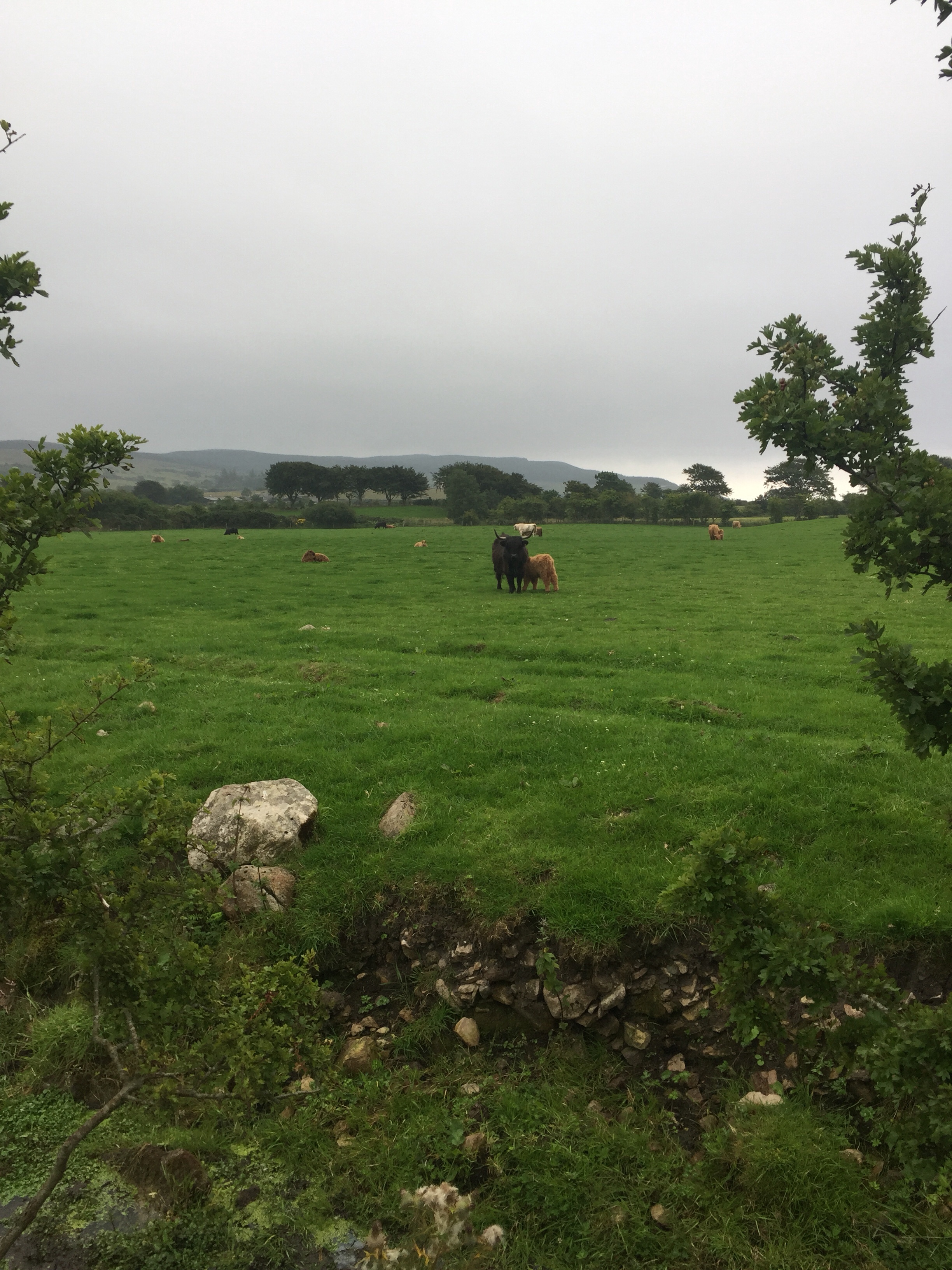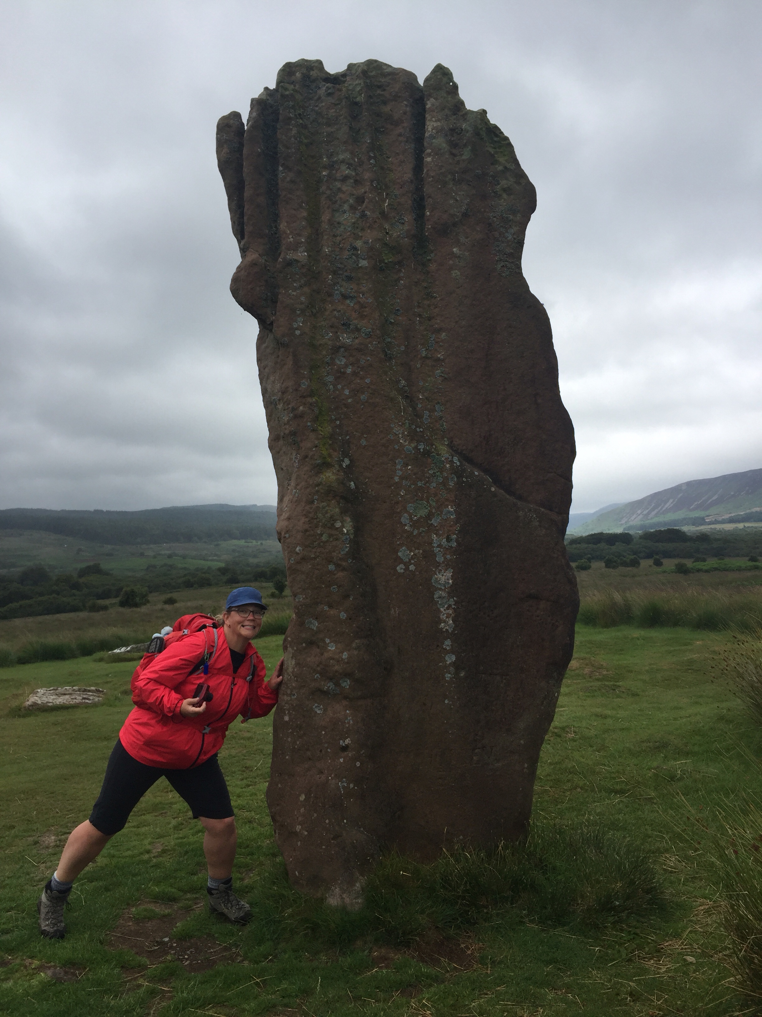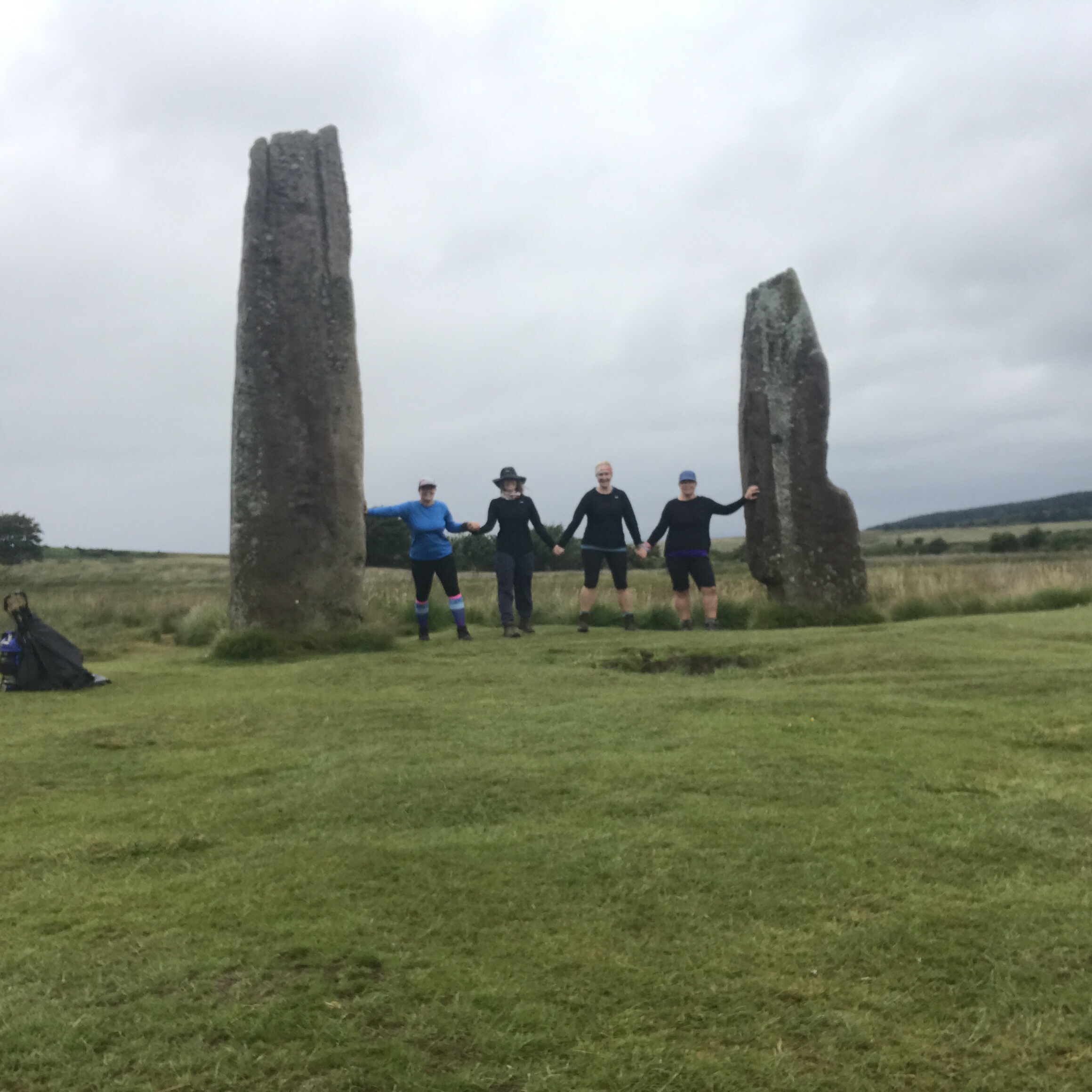 Day 3 (the real day 3 – sorry about the typo on yesterday’s post) here on the Arran Coastal Way was amazing. We walked from Machie to Lagg just over 20kms and loved every minute of it. A day full of amazing views, challenging and beautiful trails, and many a quintessential Scottish moment. Cheryl and I couldn’t believe how many Scottish moments we got in before noon!We began our day at 8am with a full blown Scottish breakfast – complete with Black Pudding or Haggis. Shar and I of course took the Haggis, we both love it. Rosa had Haggis too but Cheryl went with Black Pudding. She originally hails from Newfoundland, Canada where Black Pudding is a regular menu item and she wanted to know if it was as good as home. It was!We dallied way too long at breakfast but how could we help ourselves with such an awesome meal, beautiful sunny dining room and all the tea and coffee we could drink. Ok full disclosure here… we were expecting rain and no one was ready to get out there into the potential sogginess.Leaving our B&B, the amazing owner woman lady (I feel so bad I can’t remember her name) knowing our love of Helian Coo’s offered to take us out to her family’s pasture where she raises them for a ‘wee look’ before she drops us off at the start of our day – heck yah!We met Aggie a beautiful brown mom nd her baby, and another black Coo (I don’t remember her name) and her babe – they are absolutely adorable! Standing in a classic scotch mist rain seeing Helian Coo’s – now that’s quintessential!Oh my goodness they even have a Coo named Pippa and she knows her own name. The B&B gal called it out and all the way across the field Pippa raised her head and made to come our way! She is the Coo way way across the field.Once we got our Coo time in, we were dropped off in Machrie (where we were picked up yesterday) to start our day of walking … with standing stones! Oh wow, wow, wow. Sadly, Rosa did not hear the buzzing of bees and find Jamie Fraser but we had an awesome time all the same!Overall I think there was 3 or maybe 4 standing stone circles in that field – some more impressed than others in size but all pretty awesome to see. Our standing stones excursion was a 3km+ detour and worth every blister bandaid step! Just amazing how they have stood the test of time. From the standing stones we made our way the couple of km to King’s Cave. This is the cave where Robert the Bruce hid out and they say spoke to the spider who changed the course of Scotland. I have heard many a cave claim the Robert and spider story so I am not sure about that but it was amazing all the same!The walk to the King’s Cave Park area was 1.6km on the road but once there it was the most amazing path trough the forest and across the hill top then down a rock gulley to the shore – beautiful!From the King’s Cave we continued along the coast on a gassy knoll just above the boulders on the beach heading towards Drumadoon cliffs and Blackwaterfoot town for lunch. This section of trail is so far my favourite! Easy underfoot on the knoll and then entertaining boulder hopping with amazing views of the ocean to the right and imposing beautiful cliffs to the right – wow!We wrapped up this morning with a 1km+ beach walk to bring us into Blackwaterfoot for lunch. We hit the Post Office/Liquor Store/Grocer to refill snacks and suck for our packs and then grabbed some lunch from On A Roll.I had a very tasty Scotch Pie and the rest of the crew enjoyed super fresh sandwiches. Sitting outside at a picnic table we enjoyed our lunch, took care of any feet concerns, and reviewed the trail info for the afternoon.Once back on the path, our next milestone was Preacher’s Cave at about km 1.6 – we found it. It is a massive triangle shaped cave that was used as a church in the early 1800s. Pretty neat to see! From here the guide book describes the path as ‘tortuous’ over boulder fields grown over with vegetation making for difficult and uneasy footing with very few way markers. Bang on!Well the description was correct .. but we loved it! The sun came out, the stepping up and over and across to the different rocks was entertaining, and the conversation was great. For sure our speed slowed right down as every second stone was an ankle breaker but we didn’t care – we were happy as clams out there and we saw a seal!From this tortuous path we made our way up a very steep – outside of my comfort zone – hill to the top of the cliffs where we rejoined the road.Once up the hill, we took in the amazing view and changed from boots to shoes and continued walking. We had 6.8km left to cover on the road to reach our evenings destination, the Lagg Hotel built in 1971.We walk on the side of the road where the traffic is coming at us so we can give them a chance to see us and give us some space or we can jump into the ditch. There is no shoulder on these roads and barely enough room for cars to pass so it’s a little sketchy but easy underfoot.At 3.8km we happened past a bus stop and hmmmm don’t mind if we do! We didn’t come here to walk on roads – we came to walk on paths and when there is no path, we are outta here! Sure it was only a 3.8km trek and only saved us about 30mins but wow did our feet thank us!We made it to the Lagg Hotel at just after 6pm our earliest at night so far! We checked in and even had time to shower and get into clean clothes before dinner, which was booked for 830pm. It was so nice to have our home right in the very place we were enjoying a cold pint and our meal.We even met the hotel owner who lives part-time in the Calgary area, just like 3 of our peeps! Lots of chat about the Calgary area ensued. We finished the night off with a wee dram of Arran Gold Liquor (like a really good and more real Baileys) liberally poured by Peter and then headed to bed – all secretly hoping the rain in the forecast was a bad weatherman’s joke.Brande