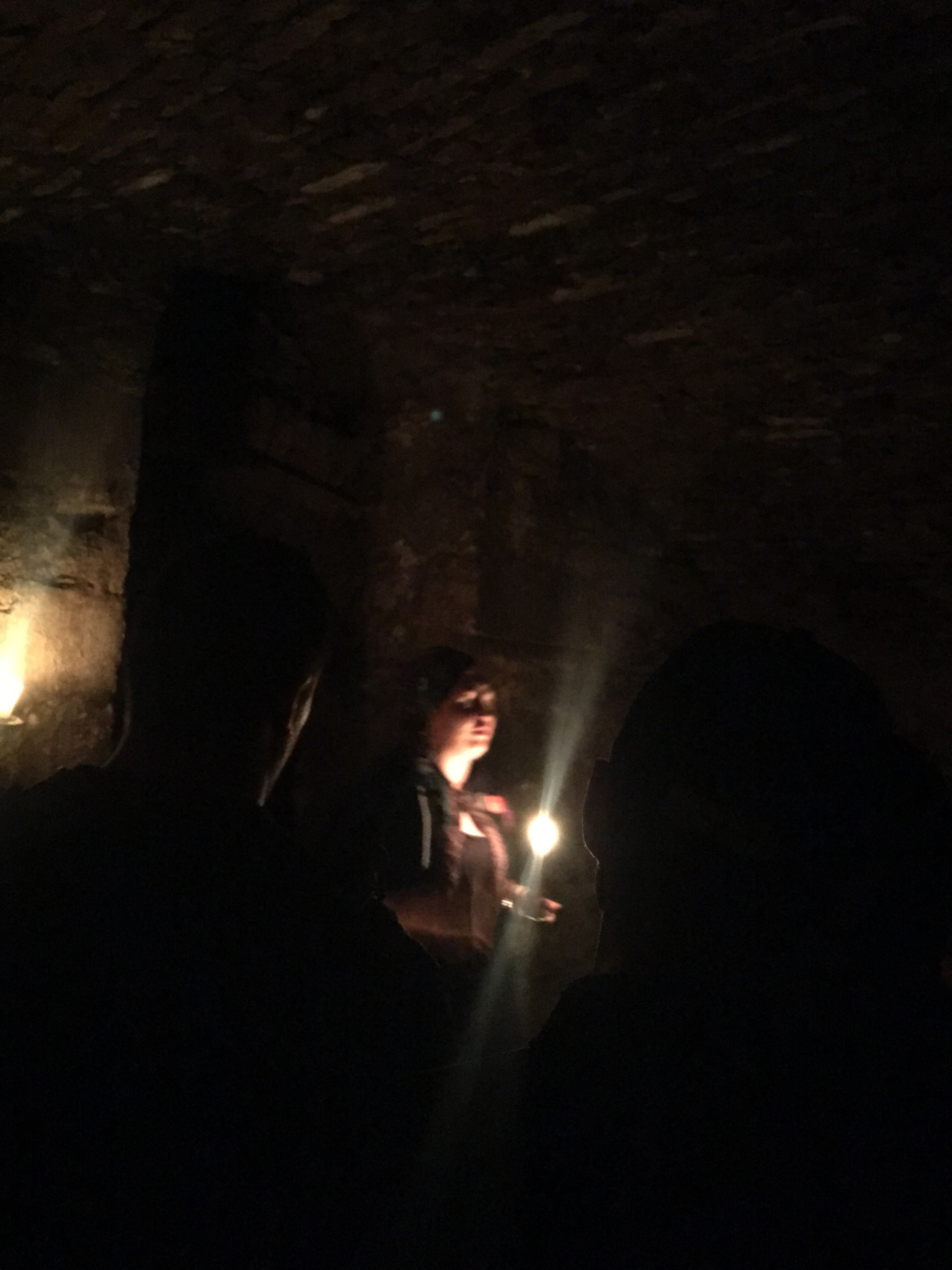 The vaults were awesome! We were so deep below the streets you could not hear any street noise or see any natural light. It was all bricks, stone, rock and coldness. They had the place lit with candles (I am sure for effect) and some electric lights on the stairwell down. It was cold, it was damp and it was creepy! Good fun! Ella would stand with her candle in hand and tell the story of each of the ghosts in the vaults.