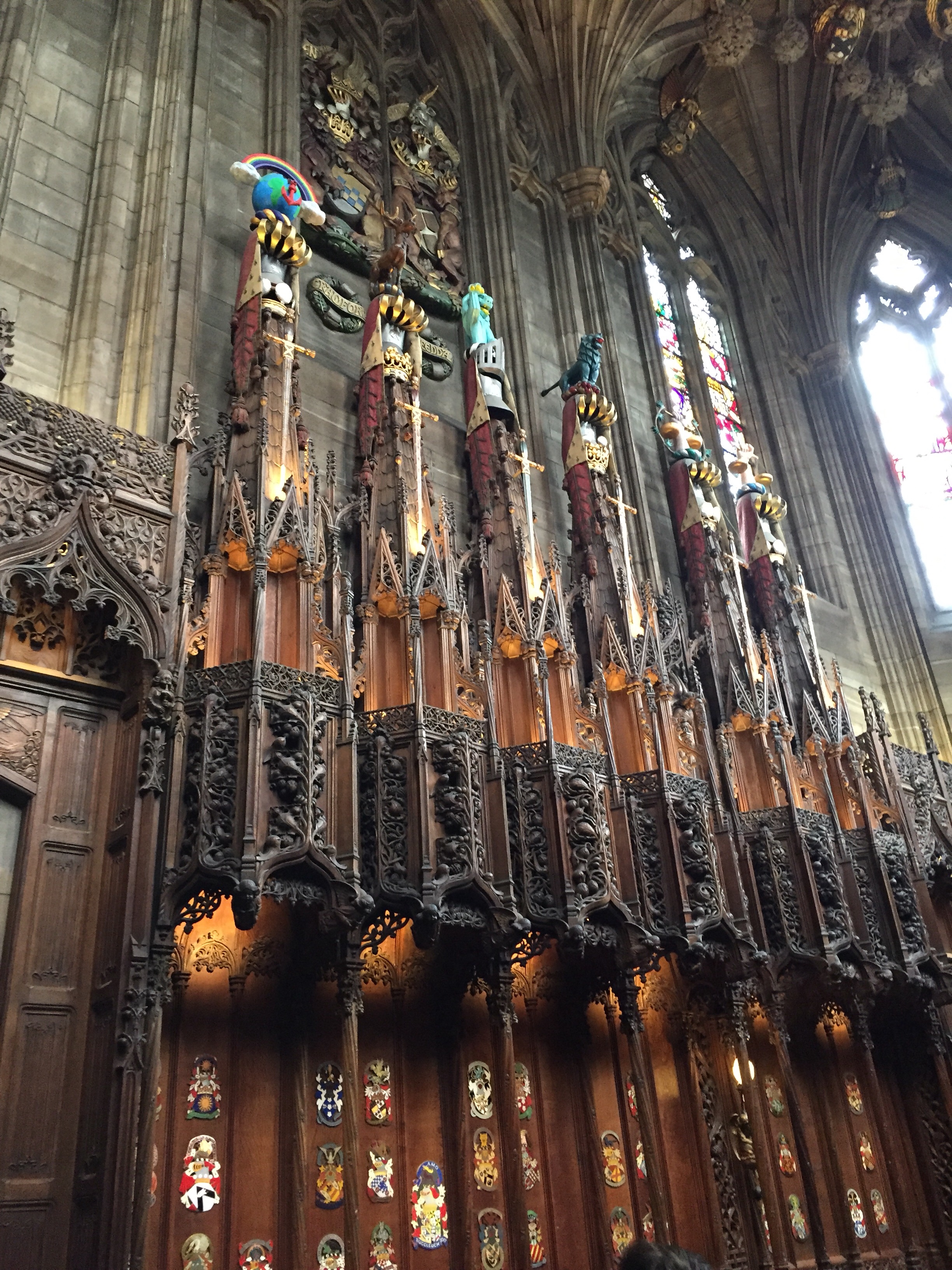 After our pints and after the Castle, we all had a chance to see the inside of a very old church that sits on the Mile. We had the chance to talk to the history lady at the church about the Order of the Thistle – the highest, elite order of knights in UK who are appointed directly by the Queen. This is not for the Sir Richard Bronson or Sir Sean Connery knights of the world but a much higher order and only 16 sit on the Order at a time. They had a women on the Order once too .. well besides the Queen herself of course. The first picture below is one wall of seats of the Order’s meeting place. The crest of each night sits above their seat.
